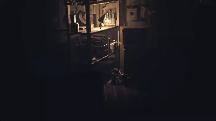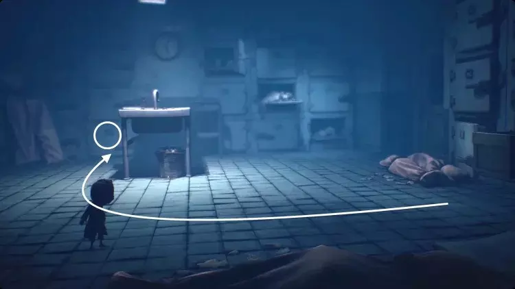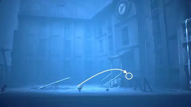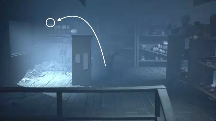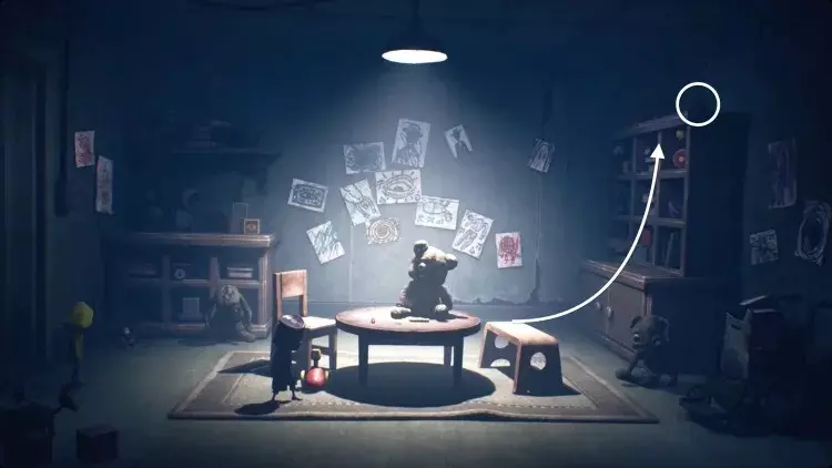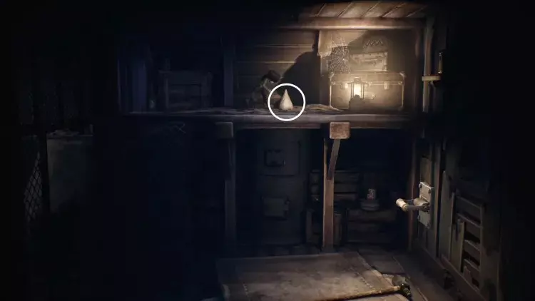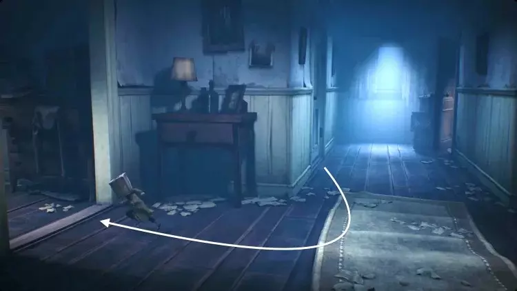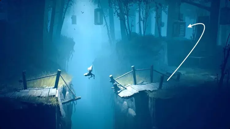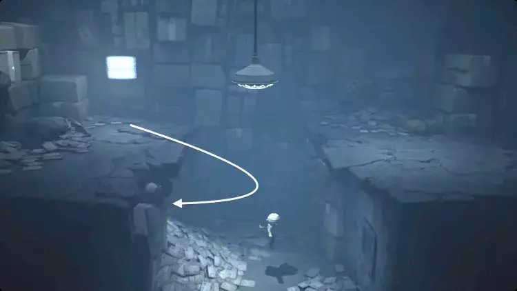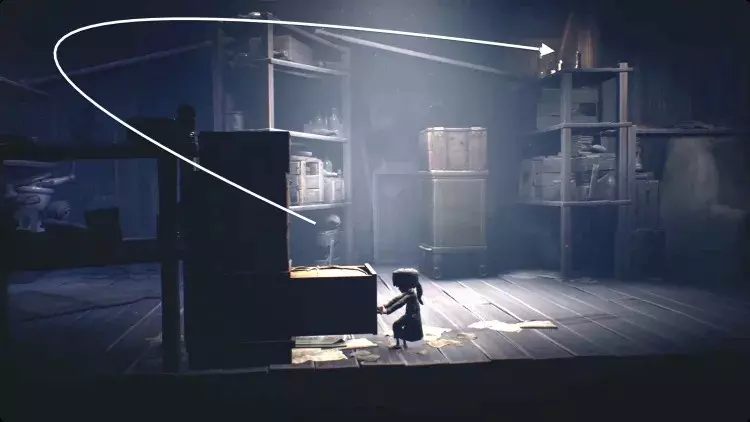跟着小 nome 走过右侧的画作。这里会很暗,但一直向右走,直到小 nome 点燃火柴。你移动时,小 nome 会大致待在你上方,所以引导它沿着房间顶部的走道向右走。当它走到无路可走时,把推车拉到它旁边。它会跳上去,你可以继续向右推。继续引导小 nome 向右,它会为你打开一个笼门,并点亮一盏灯笼。在那个房间里扳动开关,打开阁楼的灯,然后向左返回。