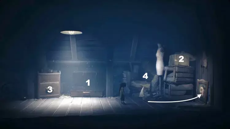 如果你安装了【Nome's Attic】DLC,那么在第一章理论上会有第三顶帽子可用。到达阁楼后,你需要通过一个小型解谜序列来获取一把钥匙。拿到钥匙后,一个诺姆会向右冲过屏幕——但这只有在DLC激活的情况下才会发生。不要跟着它,而是向左穿过新解锁的区域,开始一段短暂的追逐序列。它会爬回阁楼并试图躲起来。图片上的数字对应以下步骤。