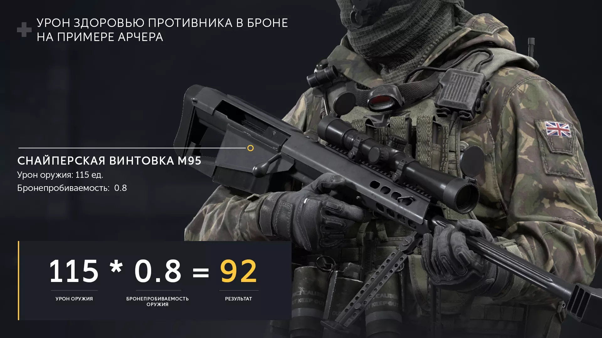 弓箭手的主武器M95狙击步枪基础伤害为115点。弓箭手的穿甲率为80%,即系数0.8。而当“老爹”尚未达到15级操作员时,其生命值仅有90点。因此,弓箭手主武器对生命值造成的伤害=115×0.8=92点——这意味着弓箭手射中操作员时将扣除这么多生命值。