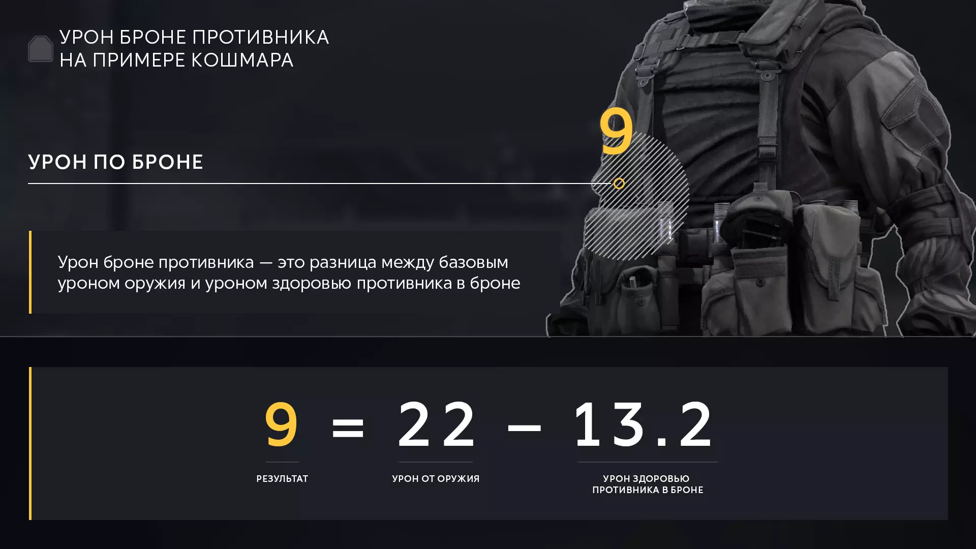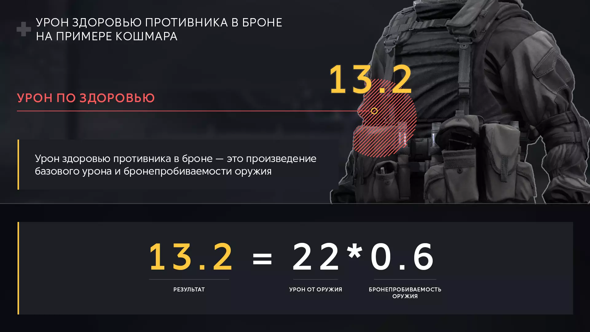 当角色装备护甲时,对其造成的伤害将通过两个公式计算:一个用于计算射击对生命值的扣除量,另一个用于计算同一射击对护甲的扣除量。我们将这两个公式分别称为【生命值伤害】和【护甲伤害】。 生命值伤害 = 武器伤害 × 武器穿甲率 护甲伤害 = 武器伤害 - 生命值伤害 护甲伤害计算 科什马尔再次向迪德的身体开枪。但这次老爹做好了准备——他拥有最高的护甲值,40点。 梦魇武器的伤害为22点。 护甲穿透率为60%,即系数0.6。 因此,梦魇主武器对生命值造成的伤害为【22×0.6=13.2】——如果梦魇击中身体,目标的生命值就会减少这么多。