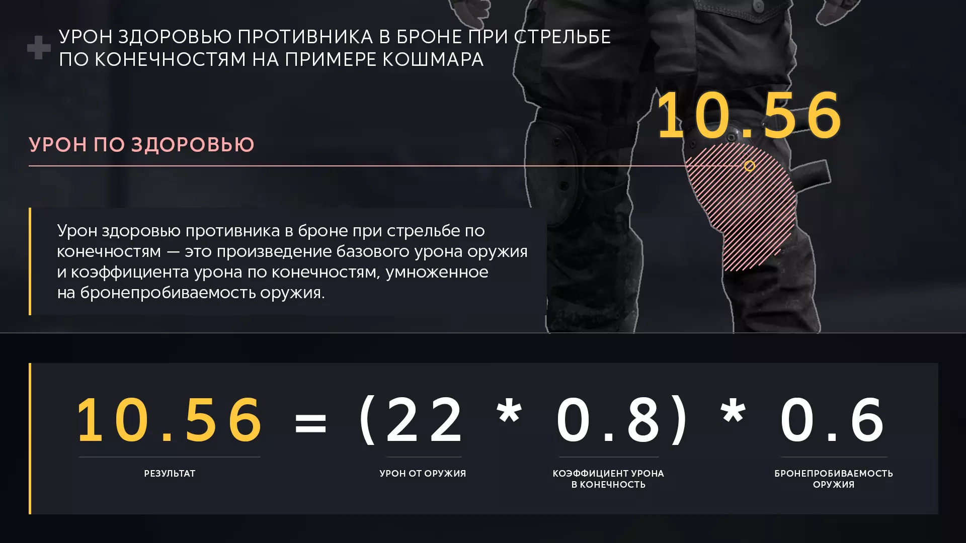 游戏在后台计算伤害时精确到小数点后六位,但实际计入伤害时存在一些特点。其中,【生命值伤害】会按小数计算。例如,“梦魇”对有护甲的干员造成13.2点生命值伤害。开启伤害显示的玩家会看到自己造成了13点伤害,但五次射击累计下来,“梦魇”造成的总伤害是66点,而非65点。而游戏会准确计算为66点伤害。 与生命值不同,《使命召唤:战区》中对护甲的伤害采用“四舍五入”的取整方法。因此,“噩梦”造成的护甲伤害并非计算得出的8.8,而是按照《使命召唤:战区》的规则取整为9。 肢体伤害 根据这一逻辑,可以计算射击肢体时对穿着护甲的干员造成的伤害。 射击穿着护甲的干员肢体时的生命值伤害=(武器伤害×0.8) 【武器穿甲值】 即“噩梦”攻击“老爹”腿部时,将造成10.56点生命值伤害:(22×0.8)×0.6=10.56。