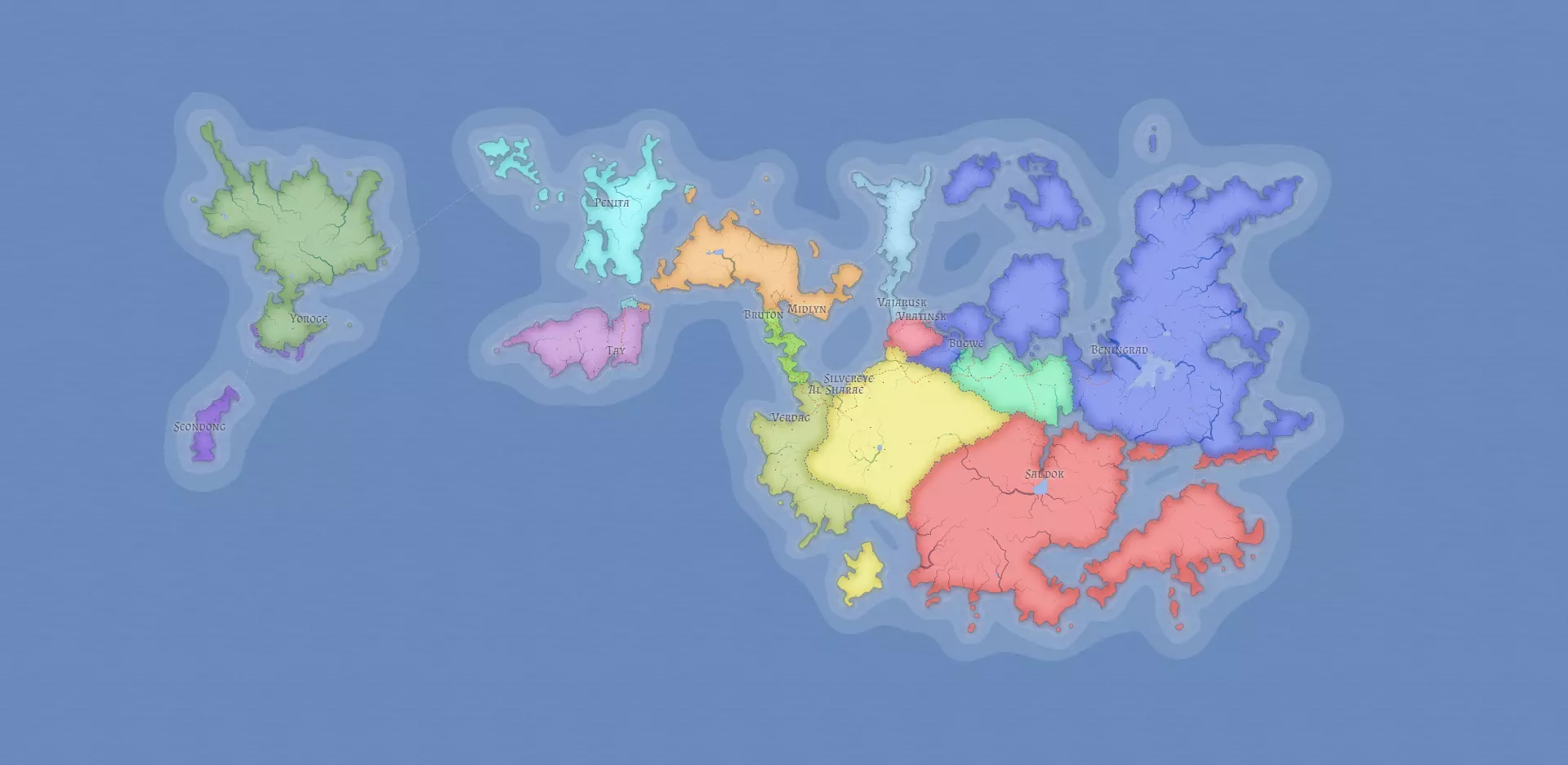 鹰联邦——贝宁格勒 渡鸦联盟——萨尔多克 戴胜哈里发国——阿尔沙拉 蕉鹃王国——布格韦 巨嘴鸟军政府——韦尔达格 鹳共和国——弗拉廷斯克 鸢寡头政权——瓦贾鲁斯克 火烈鸟议会——泰 鲸头鹳贸易公司——布鲁顿 银眼城邦——银眼(哇,真是出乎意料) 鹰沙皇国——佩尼塔 神圣猎鹰帝国——米德林 鱼鹰邦联——约罗盖 食火鸡三巨头——仙东 猫头鹰组织——基地位于北冰川和泰加林 鸽子国际警察部队——银眼 喜鹊——基地遍布红隼联盟 地图图层 政治地图