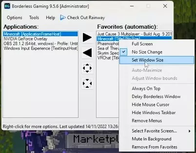 游戏所需设置。 右键点击已添加到右侧窗口的游戏,启用【无尺寸变化】功能。然后点击其下方的【设置窗口大小】选项,并在弹出的提示窗口中选择【否】。