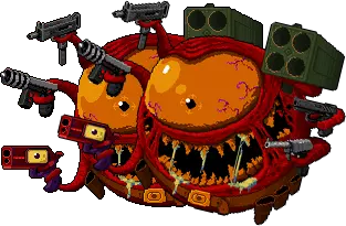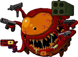 星际恐怖——昔日空降兵的首领。 “胶囊石实验室的科学家团队因傲慢而盲目,打开了星际传送门。他们并未准备好面对门另一端的存在。” 行为模式:向四周发射子弹,随后从自身发射环形弹幕。 发射多组波浪状追踪子弹,锁定玩家。会消失并召唤小型恶魔,这些恶魔会周期性地向玩家射击。 时不时在战场上制造有毒区域。 战术:躲避子弹,跳过子弹环。当 boss 发射波动自导线条时,赶紧跑到 boss 身后远处。当 boss 召唤小怪时,立即消灭它们,以免带来额外麻烦。这场战斗以及《星际伞兵》的过往内容都是对《毁灭战士》系列游戏的致敬。 沃尔夫博士的怪物