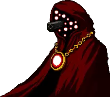 高阶祭司,是现实世界中“口径”的化身,领导着“真枪骑士团”。 首领行为: 首领向玩家所在方向闪避,并会周期性地进行快速移动。墙壁上会随机出现子弹。 首领攻击: 1. 用大环型子弹环绕自身,释放自动追踪的头骨,头骨被摧毁时会分裂成6颗子弹。随后从自身向外释放环型子弹。它会使房间变暗并开始随机传送,同时释放弹幕波。 它会伸出双手,发射螺旋状弹幕。 它会伸出双手,向四周随机发射弹幕。 它会向大范围发射三角形弹幕。 它会发射一枚快速移动且追踪玩家的弹幕。战术 在这场战斗中,你需要频繁使用翻滚,因为 boss 会发动大量扇形或圆形攻击。当跟踪炮弹向你袭来时,要向炮弹飞来的方向翻滚以躲避,否则无法避开,注意炮弹速度很快。当 boss 熄灭房间内的灯光时,站在屏幕角落是不错的位置,这样能减少遭受来自四面八方交叉火力攻击的概率。如果在这个阶段子弹出现得太近,请使用【空弹】。当 Boss 用双手进行环形射击且你站得很近时,等待两个圆环合并为一个后,翻滚穿过它们以躲避两次攻击。其他情况下,最好保持一定距离,因为在远处更容易躲避子弹。 【杀戮之柱】/ Kill Pillars