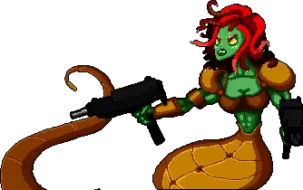 “水母水母——许多新手枪械师最后看到的东西。在它出现时,下降机制会变成石头,它的尖叫能从帷幕后召唤子弹。” 行为: 1. 释放半透明波纹,使玩家石化,石化效果持续期间无法射击。可以通过转身背对 Boss 来躲避。 2. 潜入水下追击玩家,并在身后留下有毒轨迹。从两侧向中心发射一长串双炮齐射。站在 Boss 正上方可以完全躲避此攻击。 发射全方位的环形弹幕,弹幕间有小空隙。这些空隙会随着远离 Boss 而逐渐闭合。 发射全方位的弹幕连射,弹幕间有小空隙。 战术:首先要避开毒素,不要让自己陷入毒环中。当 boss 在水下追击你时,一个不错的战术是将其引至墙边,这样能更轻松地躲避后续攻击。靠近墙壁时,它一半的弹幕会被直接阻挡,而且跑到房间的另一端后,你也能更容易地躲避它的攻击。但当水母开始释放环形弹幕时,你需要尽量靠近它。此时开始向她靠近,通过左右移动躲避子弹,在圆圈的空隙中穿行。如果在这次攻击时你距离过远,圆圈就会闭合,想要通过会非常困难。即将闭合的子弹会闪烁,请注意。戈尔普什卡会定期释放石化波。只需转身背对它,或者退到足够远的地方,避免被石化。弹药蟒蛇(Ammoconda)