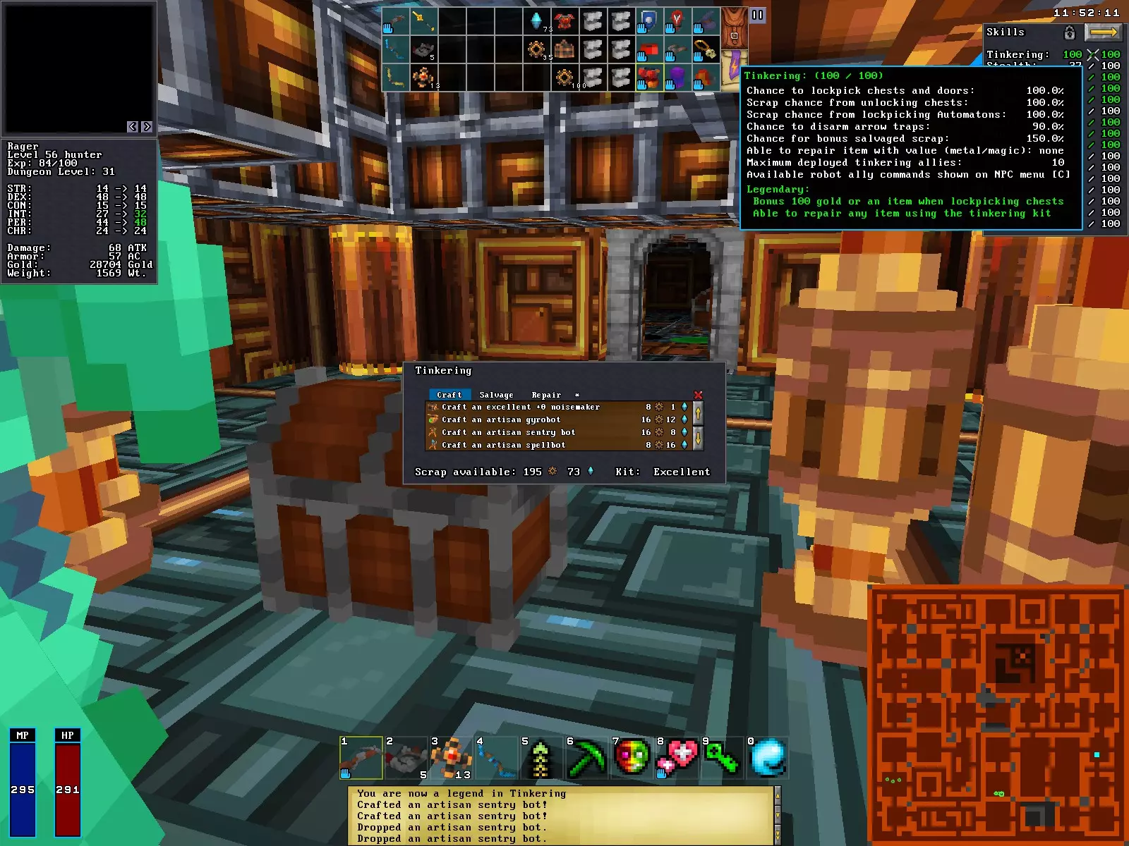 Once you've found a kit and started Salvaging stuff, you're well on your way to becoming a Legend in Tinkering! The Dev's Discord post linked at the very top of this guide gives all the dirty details, which are scattered throughout this guide, but in shorthand: -Lockpicking can raise your Tinkering at maximum to 40 (though locks are rare) -Salvaging items can raise your Tinkering at maximum to 60 -Repairing/Upgrading items pretty reliably levels the skill, but there are not many opportunities for this unless you want to waste your scrap on items you'll just end up getting rid of. -Crafting items very seldomly raises the skill. Items that cost more have a higher chance to raise it, but from quantity over quality, I had better luck levelling the skill from crafting Bear Traps. I don't have a great suggestion to use your Magic Scrap on; even crafting Spellbots doesn't level the skill often. -Overall, using crafted items against enemies is the best way to level the skill once you're up to 60+. -Turrets are great, but not mobile, though you can carry them with you. -I had great luck with Bear Traps. Craft a stack of ~15 of 'em and lure enemies over 'em in a line towards you. Really cheesy, but it works. You can put a turret out too, to shoot them while they're trapped. -The dev's post says lockpicking will level the skill too, but I haven't earned a single point from that except once from using a lockpick to disable an automaton. -Note that the locking spell then using a lockpick doesn't work to "farm" it. -You can disable arrow traps by using your lockpick on the wall tile, but they are rare and I also never got any xp from them. When you do so, they drop their remaining quiver/ammo. Crafting Overview Now that you've salvaged hundreds of Metal and Magic scrap, what can you do with it? BUILD COOL STUFF!! XP: 10% on crafting metal/magic less than or equal to 2 (only up to 20 tinkering) 5% on metal/magic greater than 2 10% on metal or magic cost greater than 4 Traps: Toss 'em on the ground or wall and when an enemy walks into them (or if you can manage to shoot them), kaboom! There are 4 Tinkering-specific traps Flame, Freeze, Sleep, Teleportation, as well as mundane Bear Traps (floor only). Robots: There are 5 types of bot: -Noisemaker lures nearby enemies to itself for a few seconds, then breaks or turns off -Dummybot will draw enemies' attacks so you can fight them without getting personally attacked -Gyrobot is not for combat, but very cool as an assistant. Tons of options for them. -Sentry Bot and Spellbot are both stationary turrets that shoot bolts or spells at enemies The bots have a new highest level of quality above Excellent: Artisan Misc. Hardware: Bear Traps (as mentioned with Traps) Backpack Alembic Lockpick Glasses Lantern Empty Bottle Traps The traps are thrown on the ground or wall and will be triggered by stepping on/by them, or by shooting them with a ranged weapon (that can be difficult). After they've been expended, you can pick up their remains and salvage them. You can also manually disarm and pick them up and they will remain useable. Excellent +0 Flame Trap 08 Metal 12 Magic 30 Gold Salvage: 02 Metal 04 Magic Explodes in fire damage and ignites enemies for a short period Lockpick can toggle it to trigger from enemies, or ALL creatures. XP: 10% on crafting, 5% on wounding, 20% on kill Excellent +0 Freeze Trap 08 Metal 12 Magic 30 Gold Salvage: 02 Metal 04 Magic Explodes in cold damage and slows enemies for a short period Lockpick can toggle it to trigger from enemies, or ALL creatures. XP: 10% on crafting, 5% on wounding, 20% on kill Excellent +0 Sleep Trap 04 Metal 08 Magic 30 Gold Salvage: 02 Metal 04 Magic Puts nearby enemies to sleep Lockpick can toggle it to trigger from enemies, or ALL creatures. XP: 10% on crafting, 5% on sleep Excellent +0 Teleportation Trap 04 Metal 08 Magic 30 Gold Salvage: 02 Metal 04 Magic nearby enemies are teleported to a random location on the level. Lockpick can toggle it to trigger from enemies, or ALL creatures. With this trap you can also use the lockpick to cause: "The trap starts pulling magical energy towards it!" That means that another teleportation trap will send the creature to this trap. This destination trap remains active, but the one that got triggered is expended as normal. You can use this to set up an area surrounded by other traps or turrets, and then just throw teleport traps at enemies to warp them to their doom! -If you have multiple destination traps set, they take turns in the order you laid them. XP: 10% on crafting, 5% on teleport Excellent +0 BearTrap 12 Metal 00 Magic 50 Gold Salvage: 04 Metal An enemy that steps on this takes damage and is temporarily immobilized. This is the only weapon that does not cost both types of scrap, and can be salvaged, and can level your skill through both its crafting and use. It also stacks in your inventory. Overall a good choice if your focus is raising your skill. XP: 10% on crafting, 10% on trapping At Tinkering level 60+, these are crafted at the Excellent quality level. They may be lower quality at lower skill levels. Bots You are restricted in how many bots you can have deployed at a time. At Tinkering level 60, you can have 6, the next tier is 8, and at 100 you can have 10. I liked to have 3 gyrobots following me, and 7 turrets deployed in the starting room usually. Equip them, toss them on the floor, and they're active! As your Tinkering level increases, you gain access to more of their commands. Artisan Dummybot 08 Metal 04 Magic Level 15 and 200HP, Heal spells work on it. 50 Gold Salvage: ? Toss this box down and out pops a jack-in-the-box holding a shield. Enemies are likely to attack it instead of you. -You can gain xp from attacking these, which seems to be different from the rest of the bots! At least up to 20 in Unarmed or Polearm, has not been comprehensively tested. Excellent +0 Noisemaker 08 Metal 01 Magic 50 Gold Salvage: 04 Metal Toss this box down and it simp