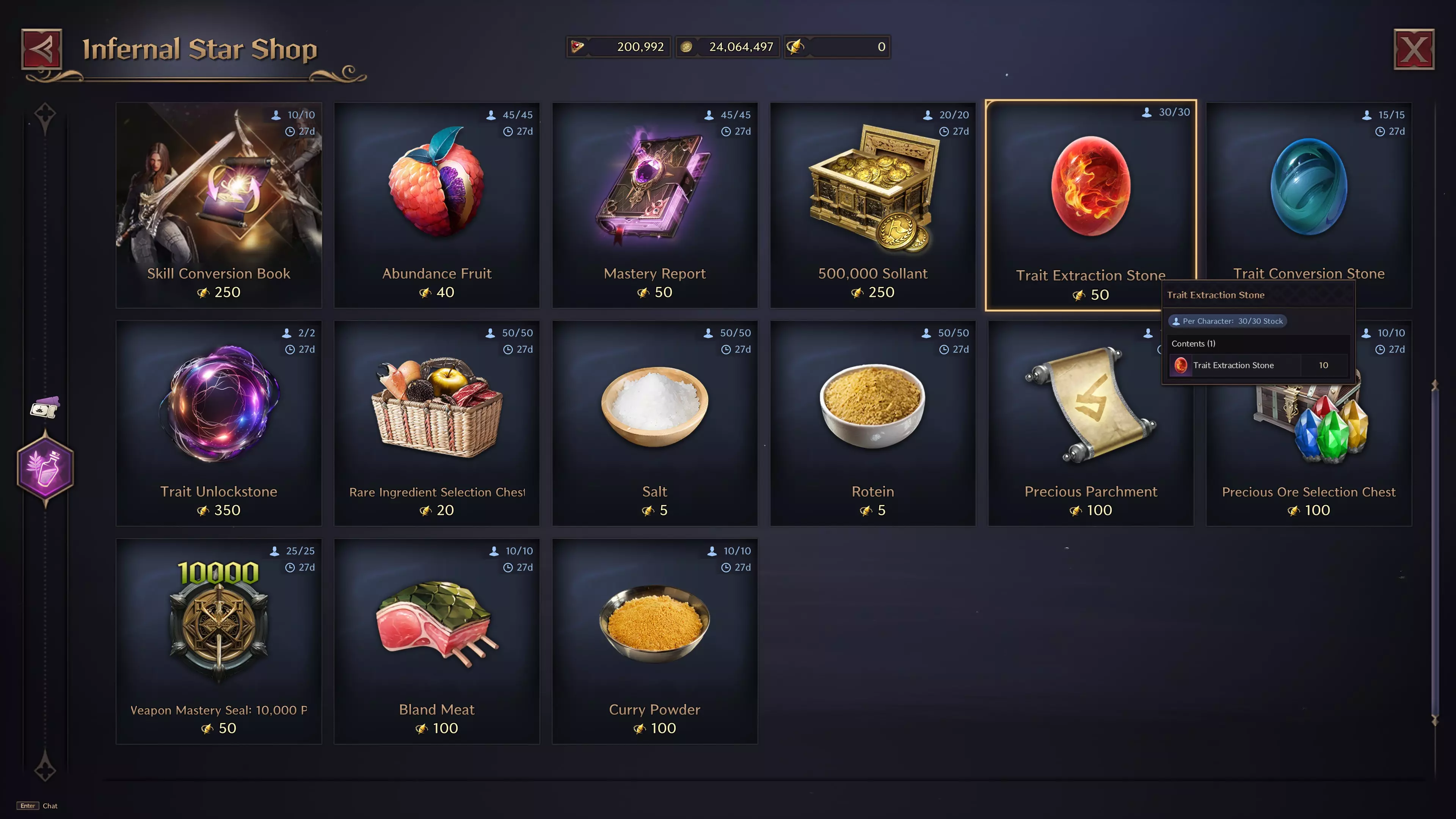 注意:这需要装备成型的角色,装备越好,效率越高。此外,这也适用于城堡奖励。城堡掠夺石的奖励会分配给所有参与的公会联盟。小型公会若能控制掠夺石,将获得更大份额,这对人数众多的大型公会而言难度较大。 附加价值: 由于单个角色的资源有限,更多角色能让玩家获得更多的特质提取石和附魔墨水。 利用战斗通行证获取【Salt-Rotein】(用于小号),可用于烹饪,有机会获得暴击物品进行出售。 我通常会优先为小号购买神器(2025年5月11日更正)和特质提取石。
