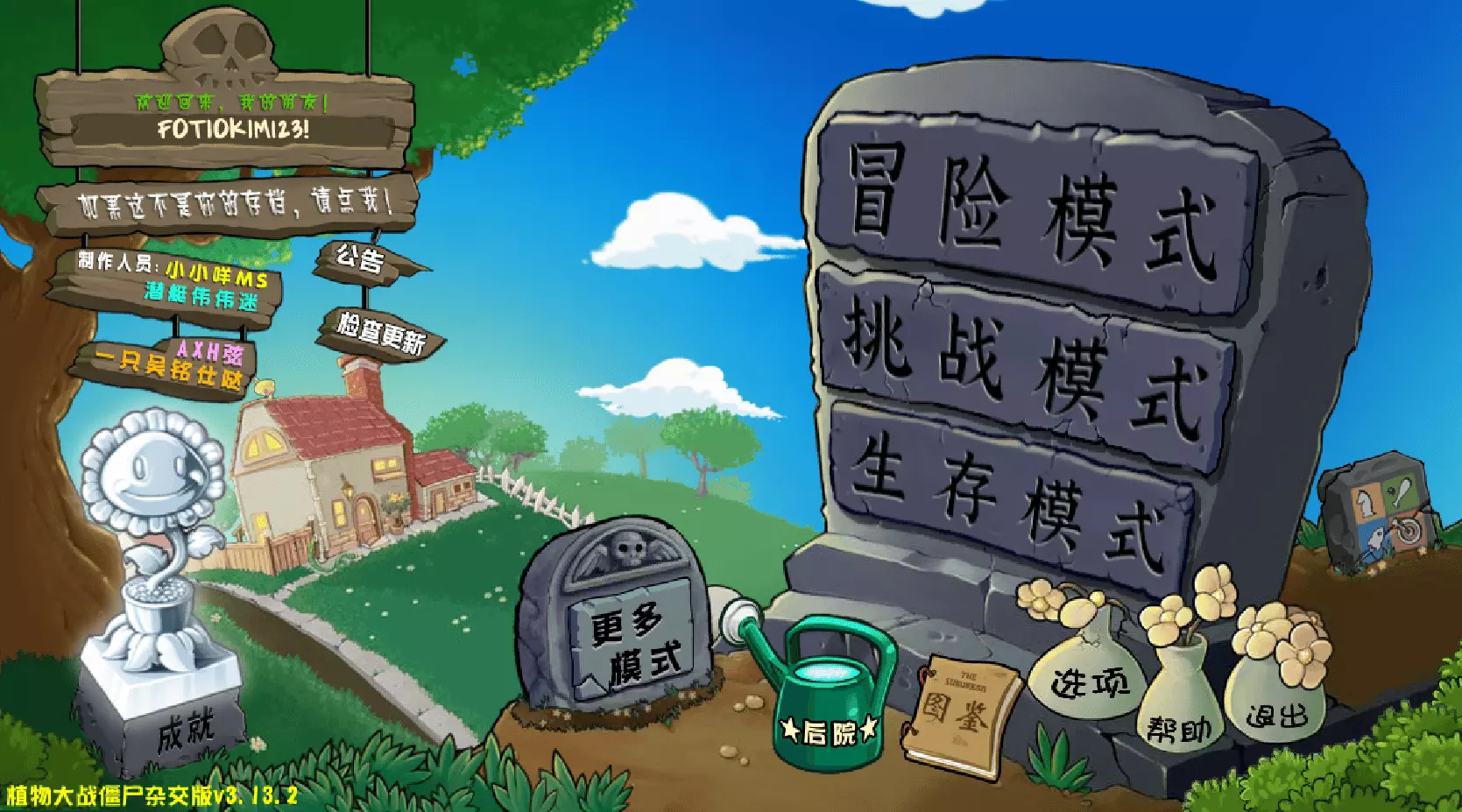 混合模式 该模式中主要包含由两种或多种植物杂交而成的植物,它们以独特方式结合了这些植物的属性和能力。模式中还加入了穿戴其他僵尸护甲的僵尸、全新类型的护甲,以及同样具有相互杂交功能的僵尸。 安装要求:版本3.13。前往指定位置下载压缩包,然后解压压缩包并运行“PlantsVsZombies.exe”文件。有趣的是,这就是那位抖音上的大爷玩的版本。压缩包密码:123