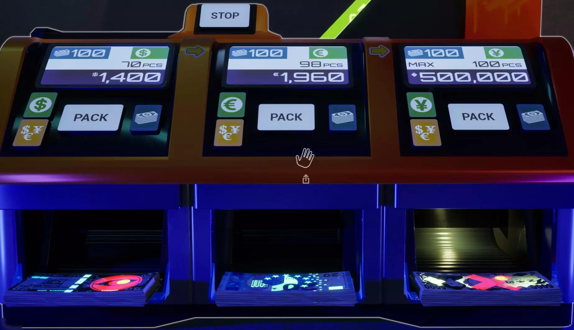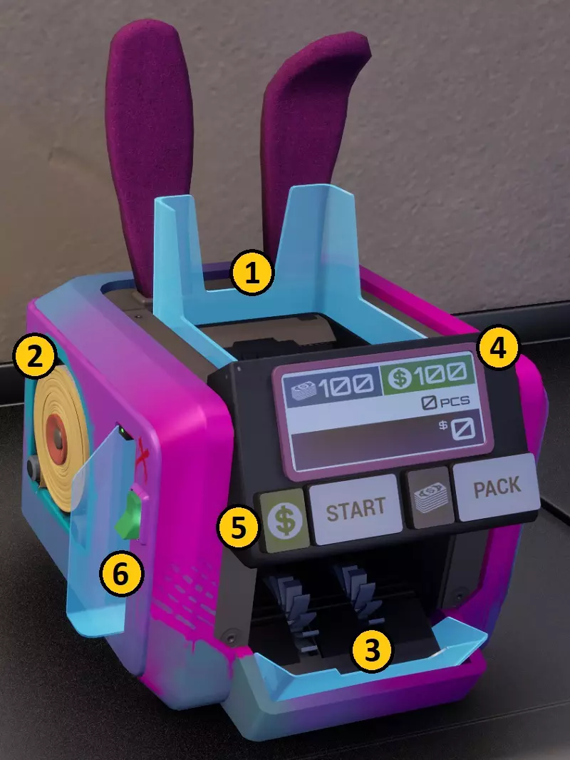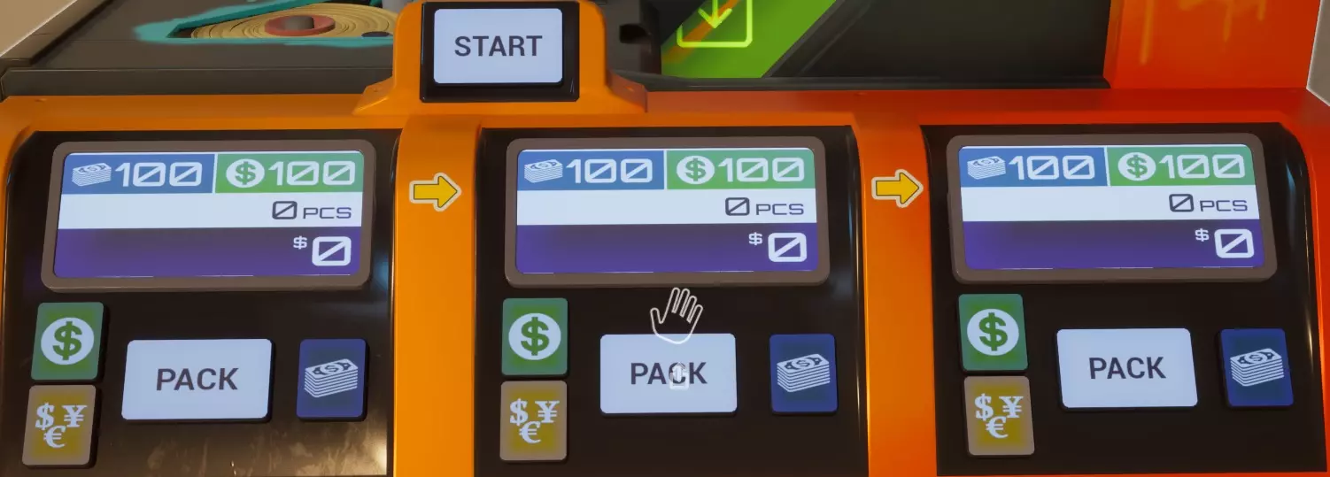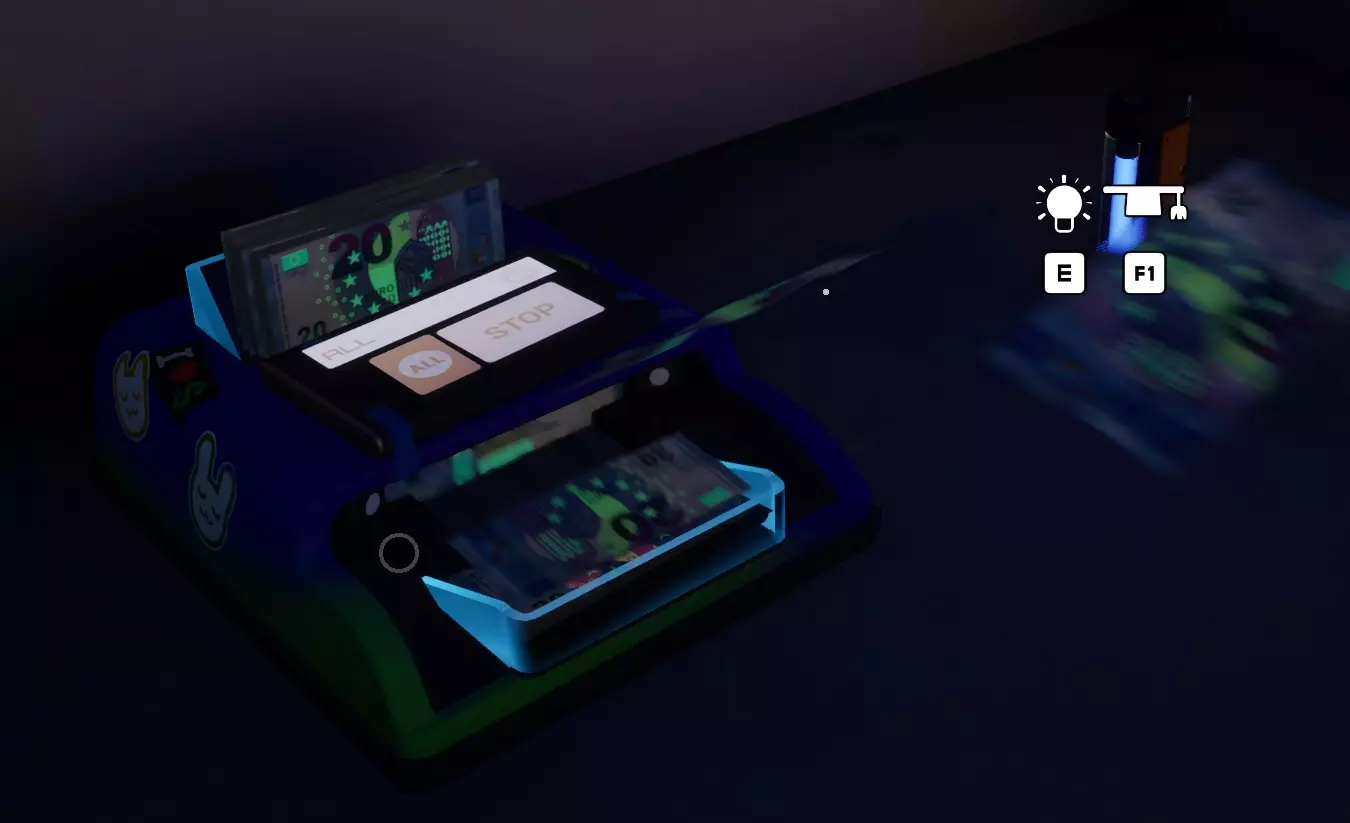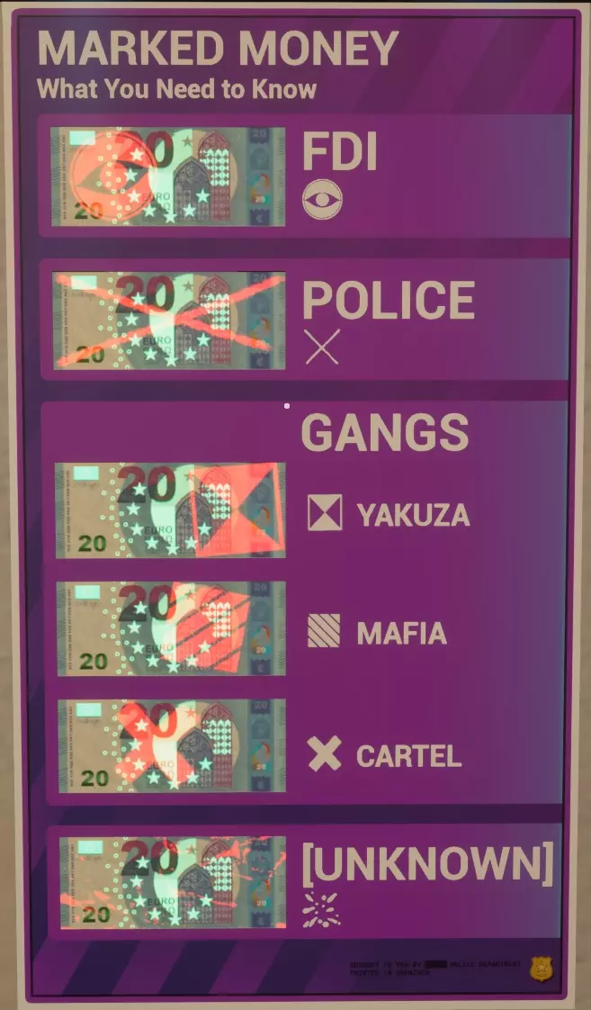 这样设置货币计数器可使其从左至右工作。空白计数设置会让机器“不停机”,因此会“溢出”到下一个输出口。最右侧设为100计数可为机器提供停止点,使其不会吐出任何钞票。你必须等待机器停止后,才能按下打包按钮来捆扎钞票。由于所有三个输出口都已完成,你可以快速按下所有三个打包按钮,然后一把抓起机器上的捆扎好的钞票。你也可以在手中已有捆扎钞票的情况下按下打包按钮。一个完全装满的XXL型号机器会产出10捆钞票,之后你需要重新装填。 标记货币 紫外线符号 这些标记需要紫外线光源,且房间需处于黑暗环境才能被看到。所有货币类型都可以带有这些标记中的任意一种。