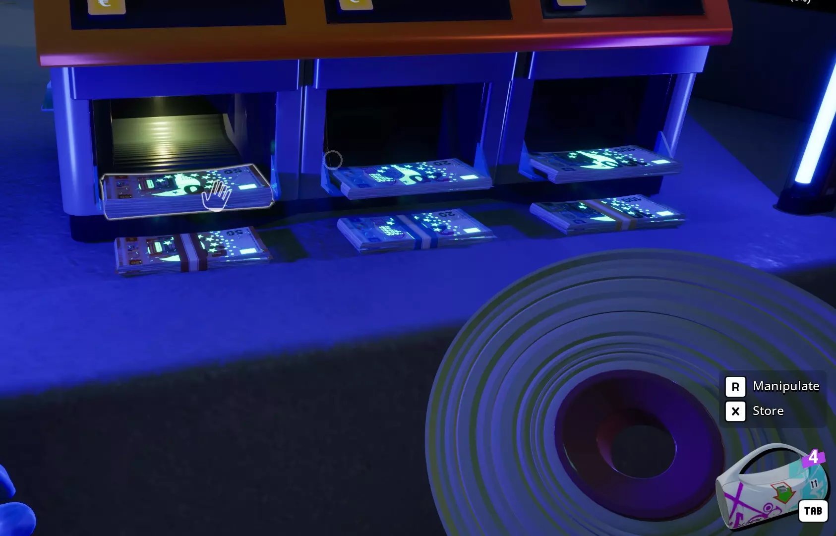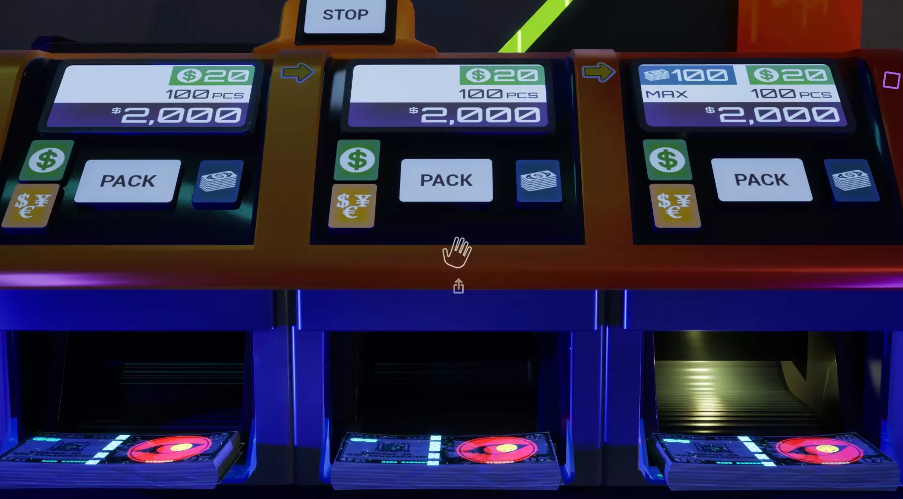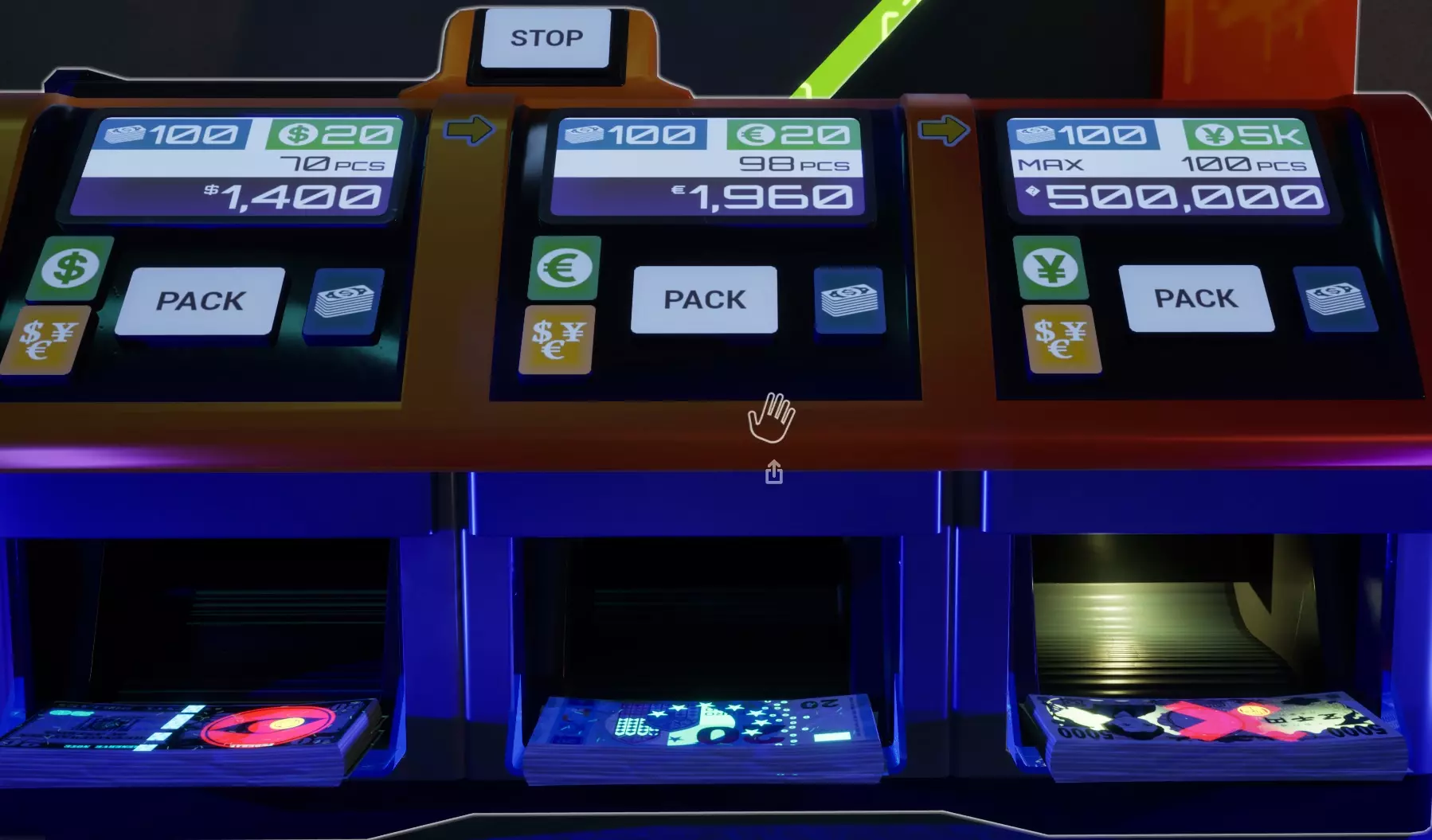 这样设置货币计数器可使其从左至右工作。空白计数设置会让机器“不停机”,因此会“溢出”到下一个输出口。最右侧设为100计数可为机器提供停止点,使其不会吐出任何钞票。你必须等待机器停止后,才能按下打包按钮来捆扎钞票。由于所有三个输出口都已完成,你可以快速按下所有三个打包按钮,然后一把抓起机器上的捆扎好的钞票。你也可以在手中已有捆扎钞票的情况下按下打包按钮。一个完全装满的XXL型号机器会产出10捆钞票,之后你需要重新装填。 标记货币 紫外线符号 这些标记需要紫外线光源,且房间需处于黑暗环境才能被看到。所有货币类型都可以带有这些标记中的任意一种。