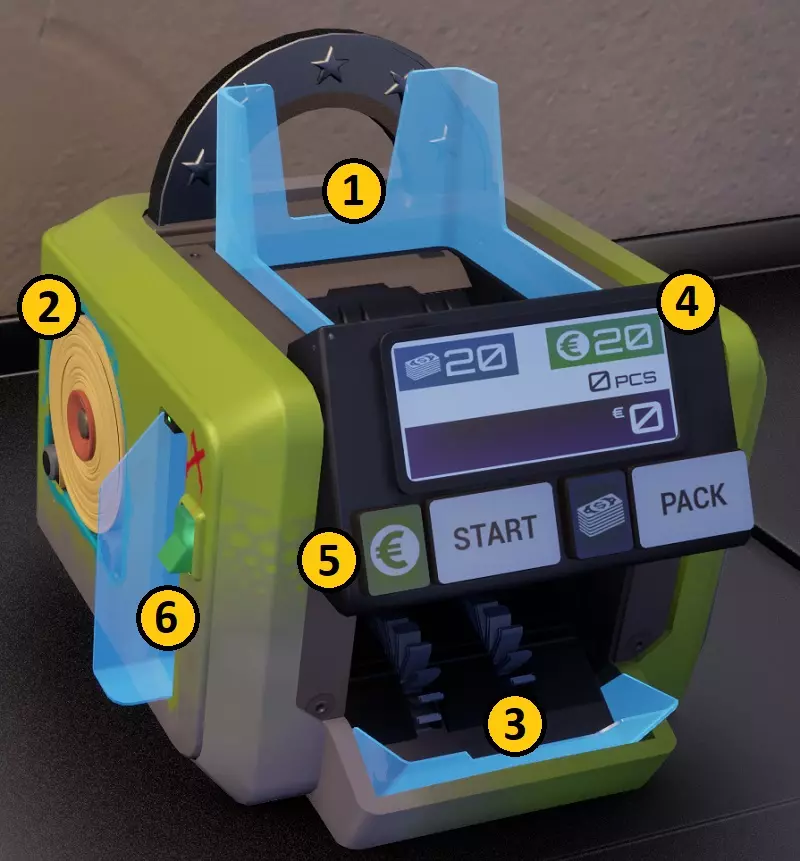 磁带插槽 编程屏幕 面额选择按钮、启动按钮、堆叠计数按钮和磁带按钮 伪钞弹出输出和切换开关 欧元货币计数器