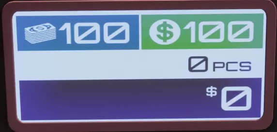 左上角:堆叠数量 右上角:货币及面额选择 右中部:输出端当前堆叠数量 右下角:堆叠总价值 堆叠数量 默认堆叠数量为100张钞票,这是最大堆叠尺寸。第一个货币计数器是唯一无法更改此数量的计数器。其他计数器可以设置为100、50、20、10以及空白计数。 选择堆叠数量便于使用部分捆束来完成请求。(例如:请求5000美元。可以用两捆100张的20美元钞票[4000美元]和一捆50张的20美元钞票[1000美元]来完成。) 空白计数是特殊设置。当选择空白时,如果堆叠达到最大值(100张钞票),无论货币、面额和选择如何,货币计数器都会持续吐出钞票。要继续对所选货币和面额进行分类,您必须清空输出。此功能在中型点钞机上不是很有用,但对XXL型点钞机而言非常重要。 按钮 按钮的功能相同,但较低级别的点钞机功能较少。 面额 货币 堆叠数量 伪钞切换
