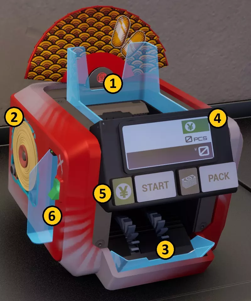 仅对日元(¥)进行分类并拒收其他货币 容量最大为两把(600张纸币) 可选择堆叠数量(默认100、50、20或空白计数) 装入胶带后,按一下按钮即可固定捆扎 能够识别并剔除假币 无法检测标记钞票 Money Counter XXL