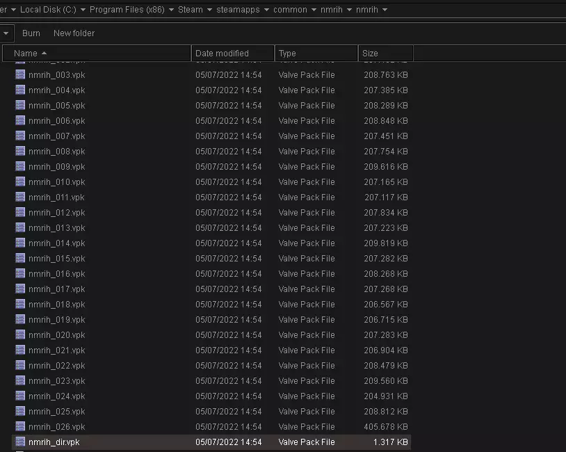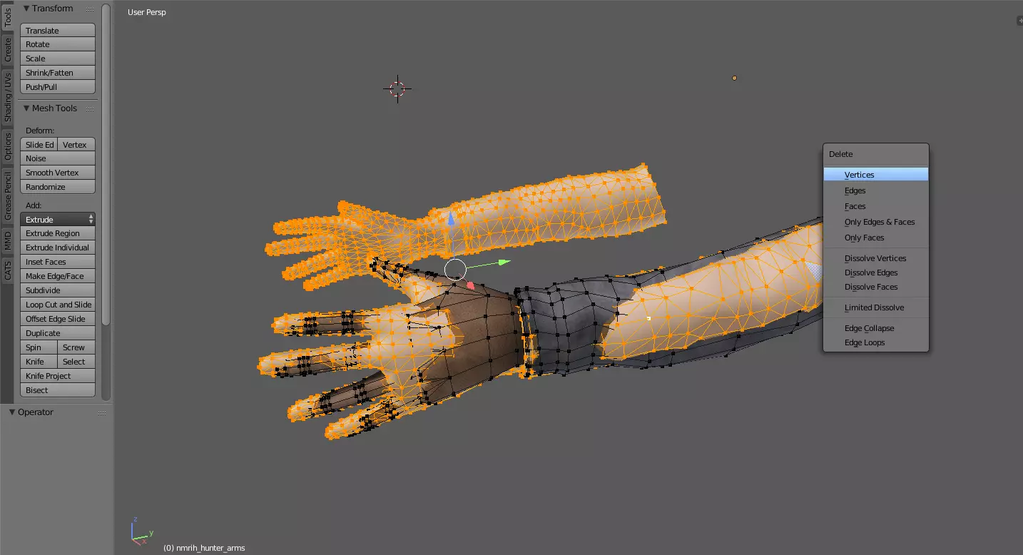 网格是不包含骨骼和纹理的模型本身。 如果手臂的多边形数量过多,在动画中变形效果会差很多。 如果手臂的多边形数量适中,在动画中应该会看起来非常好。 如果手臂的多边形数量过少,边缘会显得生硬。 如果手臂的拓扑结构不佳,权重效果会很糟糕。 反编译: 以一个原版幸存者视角模型为基础。打开nmrih_dir.vpk,该文件位于steamapps/common/nmrih/nmrih/nmrih_dir.vpk。