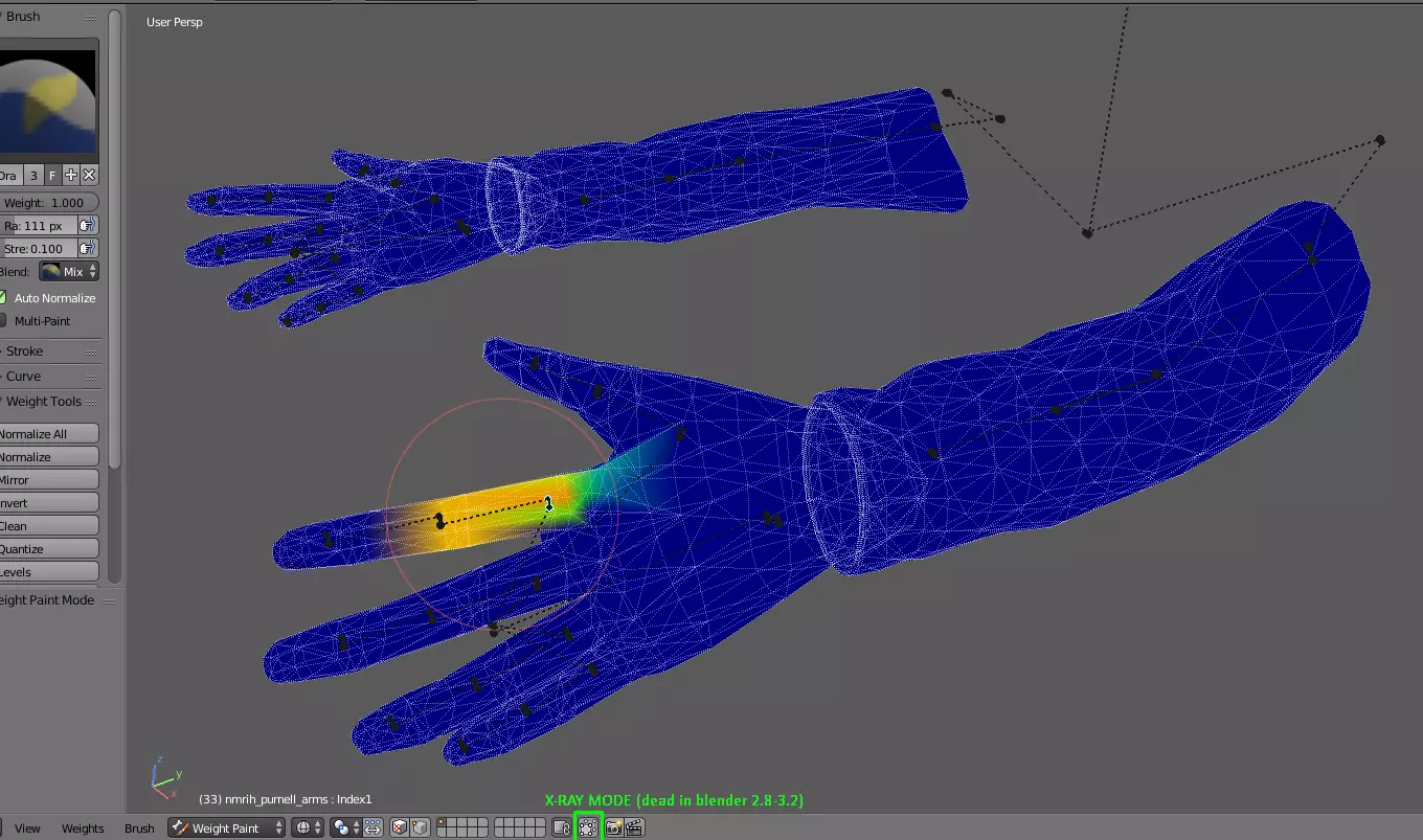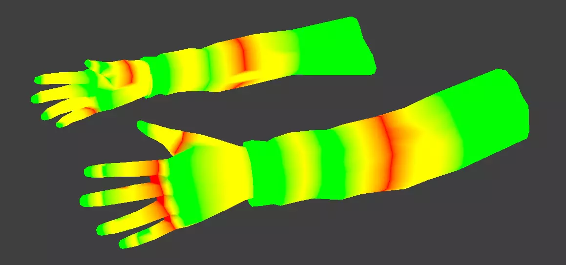 权重绘制 权重绘制主要是赋予骨骼功能。例如食指骨骼,当你绘制该骨骼所控制的区域时,该区域就会成为你绑定系统中的功能部分。你应该从肩骨开始,然后继续绘制其他所有骨骼。可以用你现实中的手臂作为参考。 忽略PSNULL、SphereGizmo以及LeftElbow/RightElbow这类骨骼。绘制它们的替代骨骼:LeftElbowTwist、RightElbowTwist、LeftWrist、RightWrist。 我的权重绘制区域