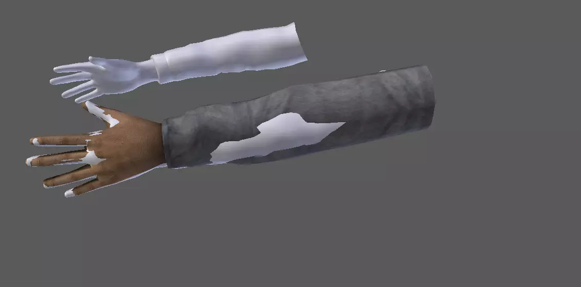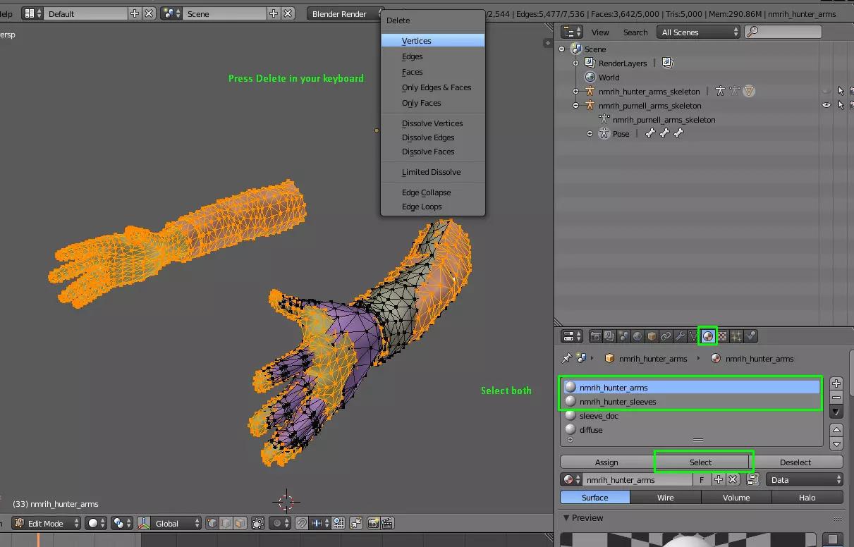 合并操作并不神秘,只需选择两个手臂网格,按下空格键并输入“join”即可。现在我们需要彻底将猎人的手臂从场景中移除,同时删除所有未使用的材质。