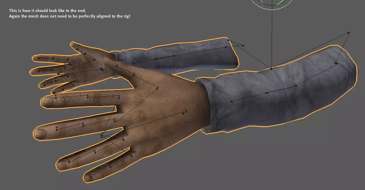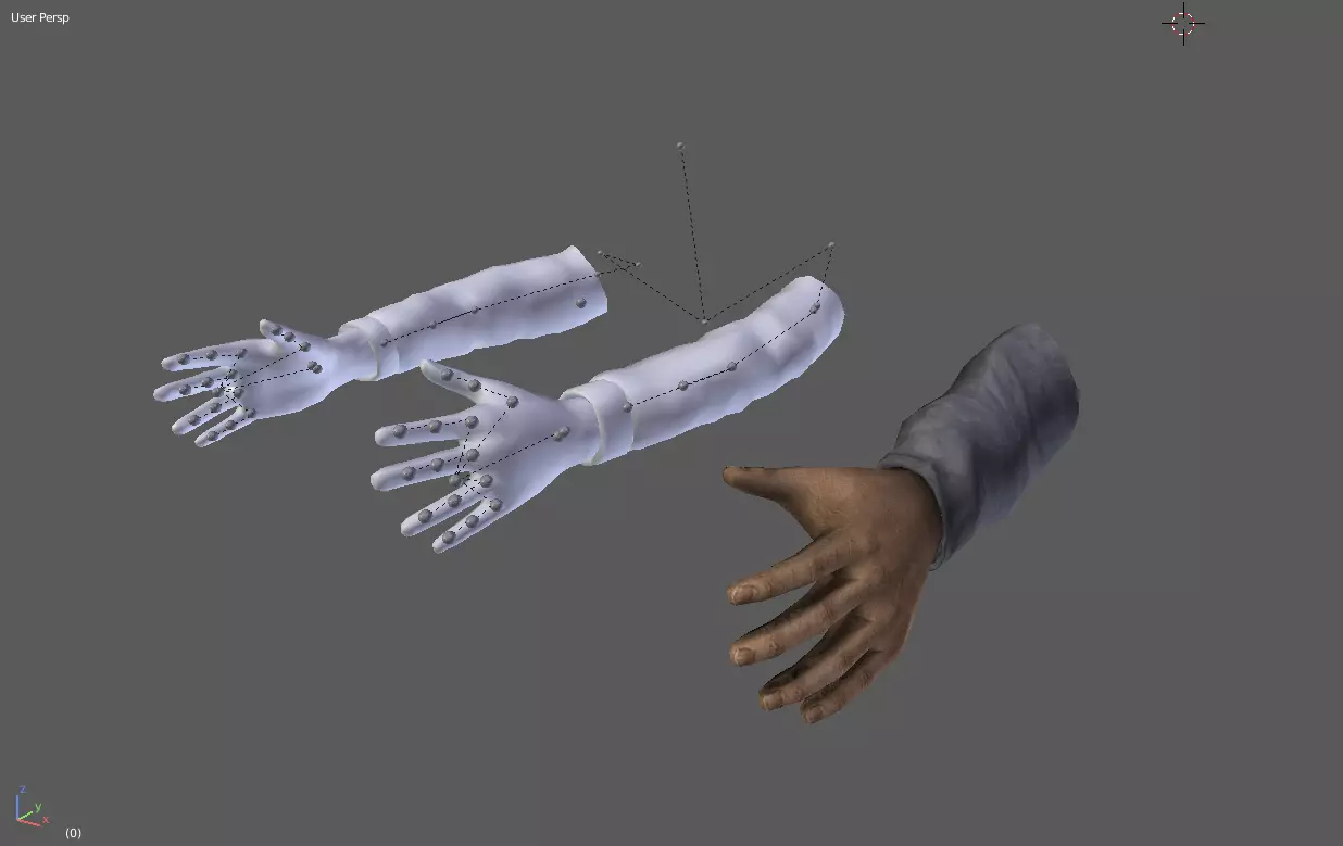 现在你需要选择自定义视图模型,并使用其旧骨骼绑定来调整姿势,使其与猎人的手臂姿势相匹配。不需要做到完美,结果大致像这样即可。
