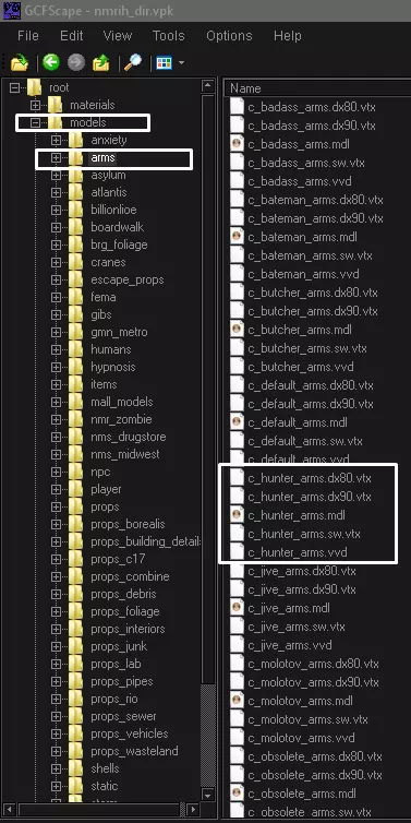 打开VPK文件后,进入models文件夹,然后打开arms文件夹。我将以猎人的视角模型为例进行说明。
