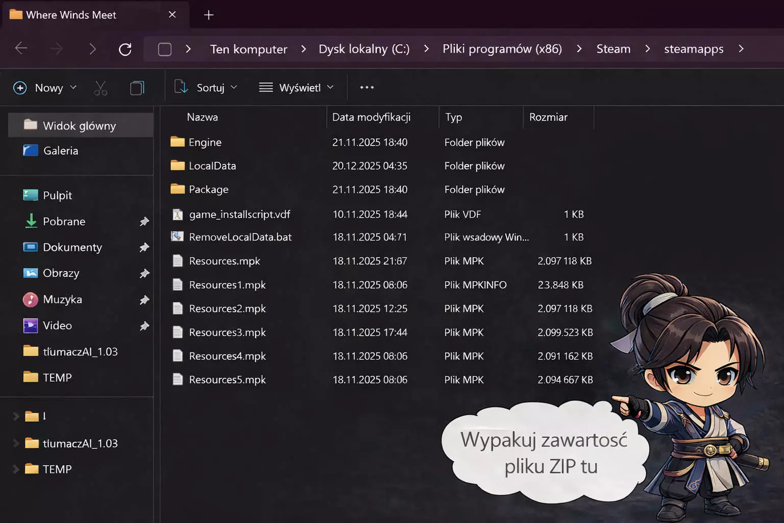 在下次游戏更新前,无法通过EXE安装程序进行安装,需要手动通过ZIP压缩包进行安装。若需手动安装波兰语本地化文件,请获取ZIP压缩包。在下一次游戏更新前,为确保汉化完整,必须进入:LocalData Patch HD oversea locale,然后在translate_words_map_en_diff文件的属性中勾选“只读”选项。请记住,当游戏推出新更新时,需取消勾选该选项! 面向希望修正文本的玩家的数据包及完整工作流程: 压缩包内包含翻译工作所需的全部文件:带标签的版本(调试版)、TSV文件以及辅助说明。此版本仅用于检查文本和识别文本行,并非正常游戏版本。 其他 如果汉化停止工作,说明游戏已推出新更新,导致汉化文件被覆盖,此时你需要等待我这边的更新。