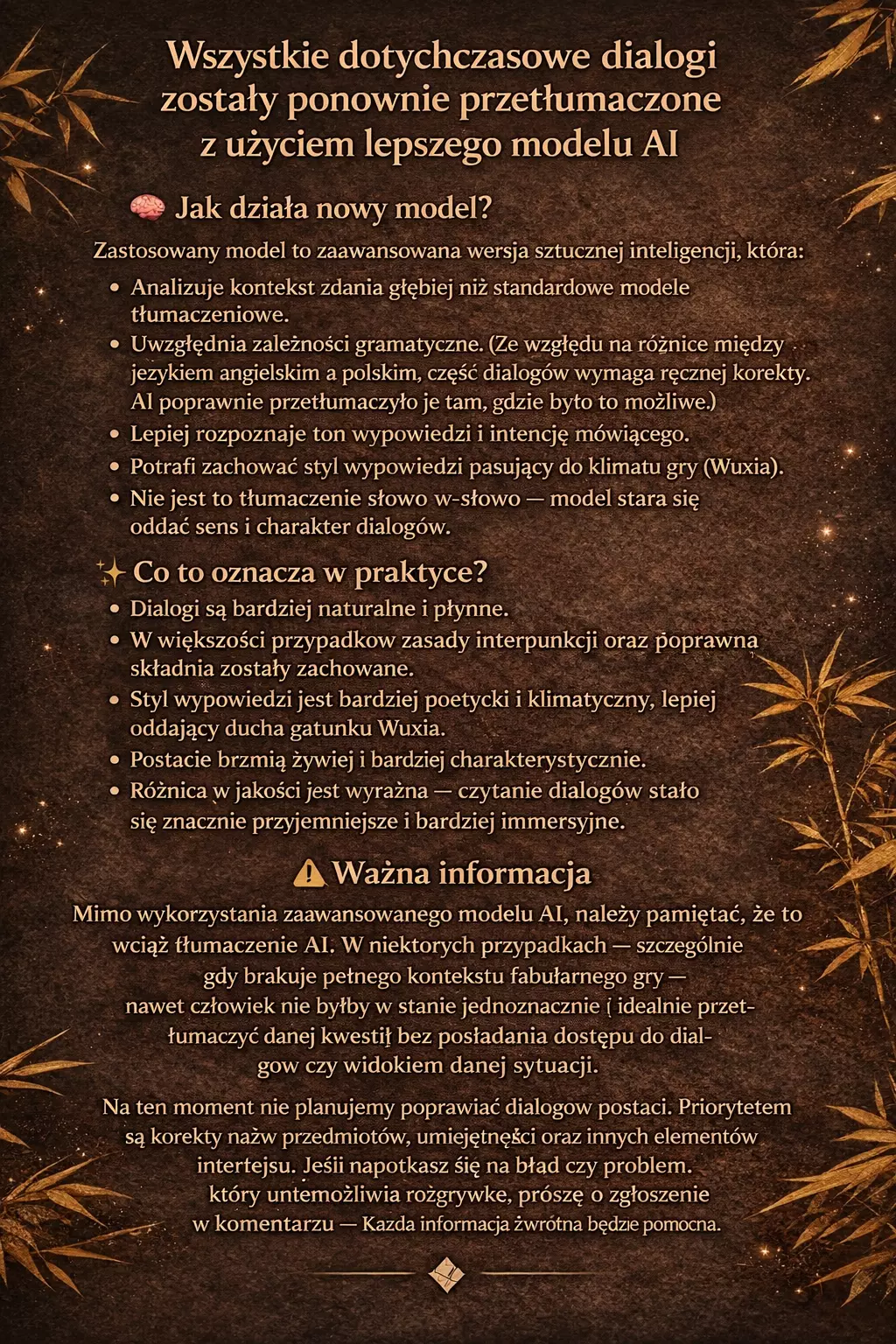 邀请你加入专注于公会及本地化的Discord服务器,在这里: - 你可以报告翻译中的错误。 - 提出关于翻译的问题。 - 讨论改进和变更建议。 - 专用频道会随时发布本地化更新信息。 此外,邀请你加入新成立的公会【鉴赏家】!我和朋友从游戏一开始就一起玩,很乐意帮助每一位新玩家,无论其经验水平如何。如果你对游戏机制、Build或任务有任何疑问,随时都可以找我们。 要求?目前唯一的要求就是……会敲键盘。 加入公会的方式: • 在Discord上给#wehy或#arimaone发送私信 • 或者在游戏内直接向公会【Koneserzy】提交申请如果您喜欢这个翻译并想支持后续工作,我提供了通过Buy Me a Coffee进行支持的方式。翻译工作需要大量时间,并且我使用更高级的AI版本来翻译新对话,这增加了成本。游戏开发者会定期添加新内容,因此持续的翻译是必要的。目前,我主要需要筹集资金来支付使用OpenAI的费用,以便能够继续推进这个项目。每一份支持都非常有帮助——谢谢!无法识别内容,已删除。
