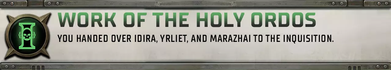 因森迪亚·巴斯塔尔-科达:一名狂热的行商浪人,不惜一切代价致力于摧毁海盗活动。她是个古板的帝国主义者,宁可看着你被烧死,也不会改变她的暴力原则。 和卡利戈斯一样,你会在第二章首次遇到因森迪亚。在第二章的加冕仪式上给她留下好印象,与她保持良好关系。她更倾向于教条主义的解决方案。 你将在第四章的足坠星再次遇到她。以对她最有利的方式完成主线任务。