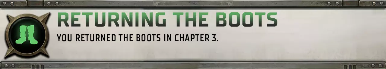在第二章完成“地下世界任务”时,当需要决定由哪个角色穿过下水道液体时,选择你自己的角色。 归还靴子
