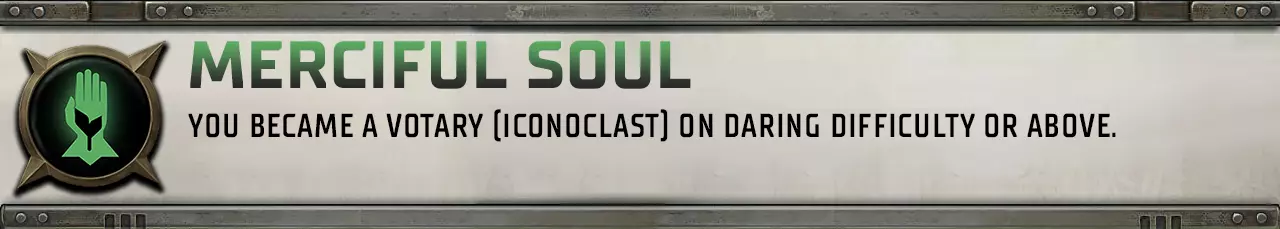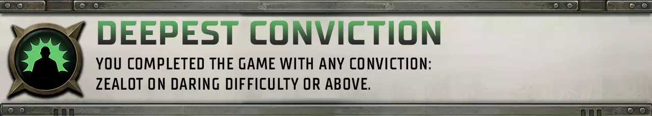 不容错过的成就之一,以无畏难度任意方式完成游戏。 Deepest Conviction