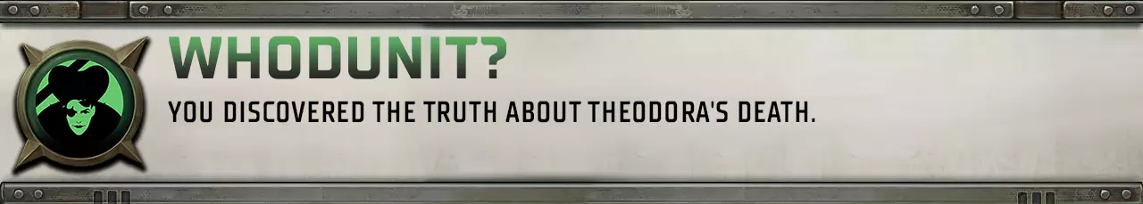 即使在序章接近尾声时,你仍有机会前往西奥多拉·冯·巴伦西亚的私人房间。在那里你会得知,自从你们见面后,她已离奇身亡。在她的死亡地点,你找不到任何能指明凶手的线索,但随着游戏的推进,你将能够查明真相。