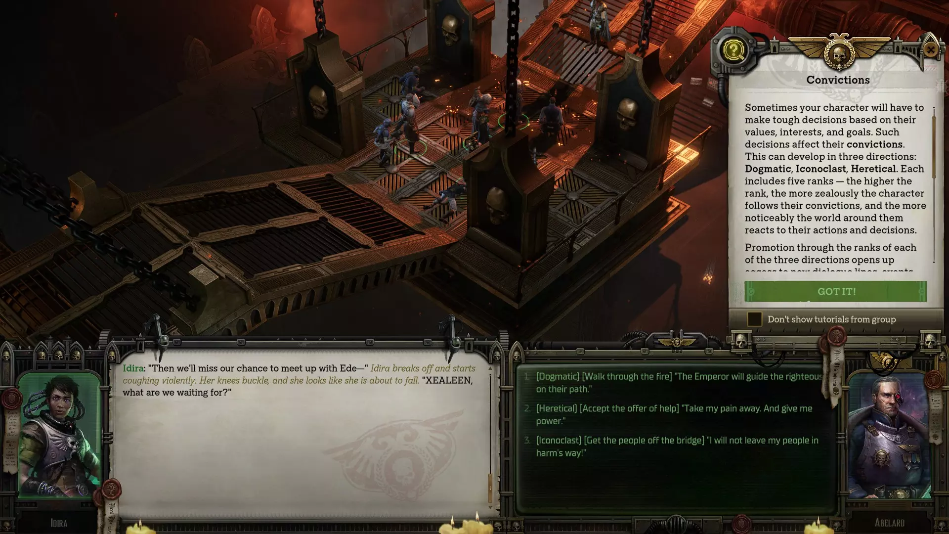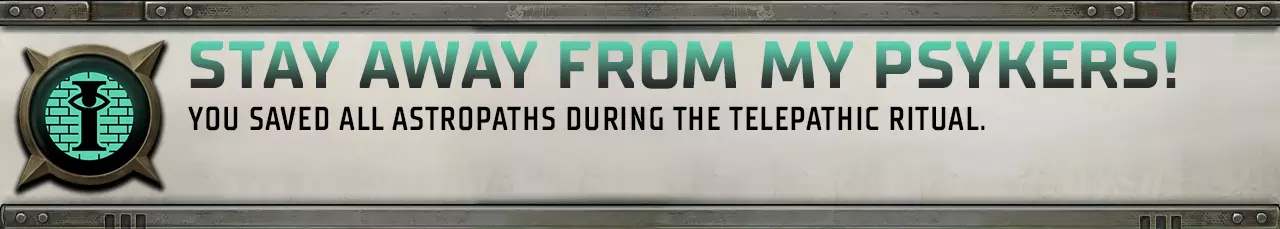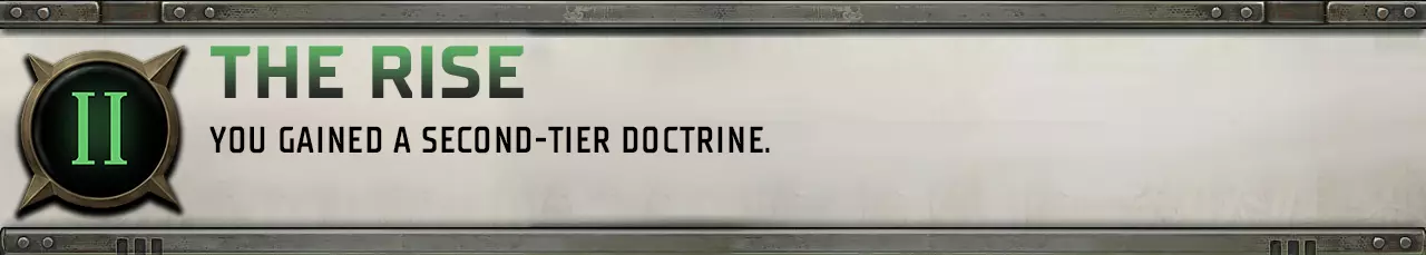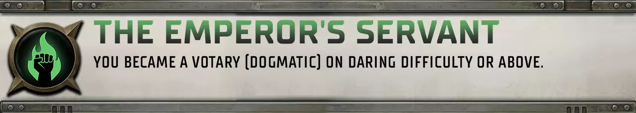 信仰帝国法律的神圣与绝对正确。遵循神皇及神圣选民的教诲,向无知且不守规矩的大众传达神皇的意志。对人类之敌抱有毫不掩饰的憎恨,无论是叛徒、异端、异星人还是混沌的仆从。 信徒:行商浪人和其盟友获得10%的几率在只剩1点生命值时存活而非陷入昏迷。 虔诚信徒:在战斗的第一回合,行商浪人队伍造成的所有暴击都会使目标燃烧。此外,敌人受到的所有火焰伤害会根据【教条信念】的等级每级增加1点。燃烧:每个回合开始时,受影响目标承受10点伤害,且必须通过一次敏捷抗性测试(-10惩罚)才能停止燃烧。 信徒:行商浪人和其盟友的任何动量消耗(包括英雄行为)减少20%。 狂热者:每场战斗一次,行商浪人可选择一名盟友(包括自身)。在1回合内,目标的所有武器攻击无视敌人的护甲。 狂信徒:直到行商浪人下一回合开始前,其对 daemon 和 xenos 的所有攻击免疫,且5格半径内所有 daemon 和 xenos 视其为优先目标。每场战斗仅可使用一次。