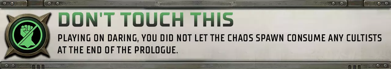 在战斗开始前进行存档,因为游戏允许你在部署队员的阶段这样做。混沌卵以及其他几名异端教徒将与你战斗。【吞噬】是该首领吸收友方生物的技能,可恢复其30%的生命值,因此获取该成就最简单直接的方法就是先消灭所有教徒。没有教徒,就没有可吞噬的目标。
