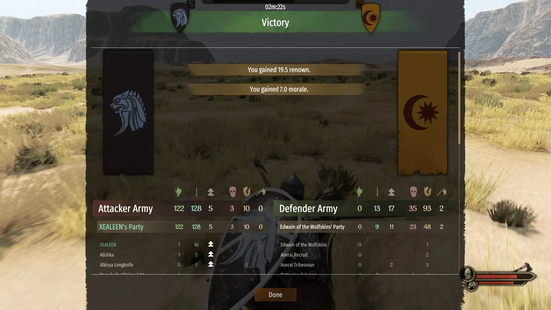 要达成此成就,你必须给在兵力上远超你的军队造成一场毁灭性的失败。你可以独自完成此成就(如截图所示),但通常情况下,你会是处于劣势兵力军队中的一员。《骑马与砍杀2:霸主》是一款优秀的游戏,它证明了重要的并非战士的数量,而是你的战术能力和士兵的质量。