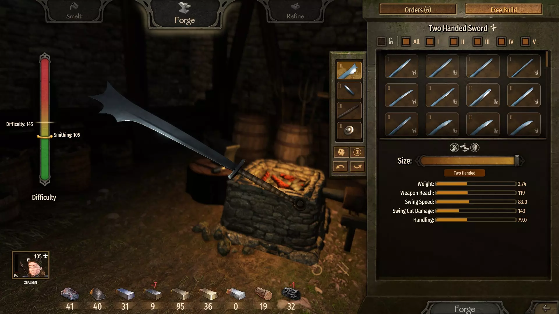 这是一个相当简单的成就,它需要锻造技能,但甚至不需要将其提升到最高的300点。 当你打造不同难度的武器时,特定等级的武器部件将为你解锁。虽然在列表中找不到6级武器部件,因为最高是5级,但你的锻造技能越高,打造的武器难度越大,武器获得6级的几率就越小。所以你可以看到,我用105点锻造技能就获得了6级武器。