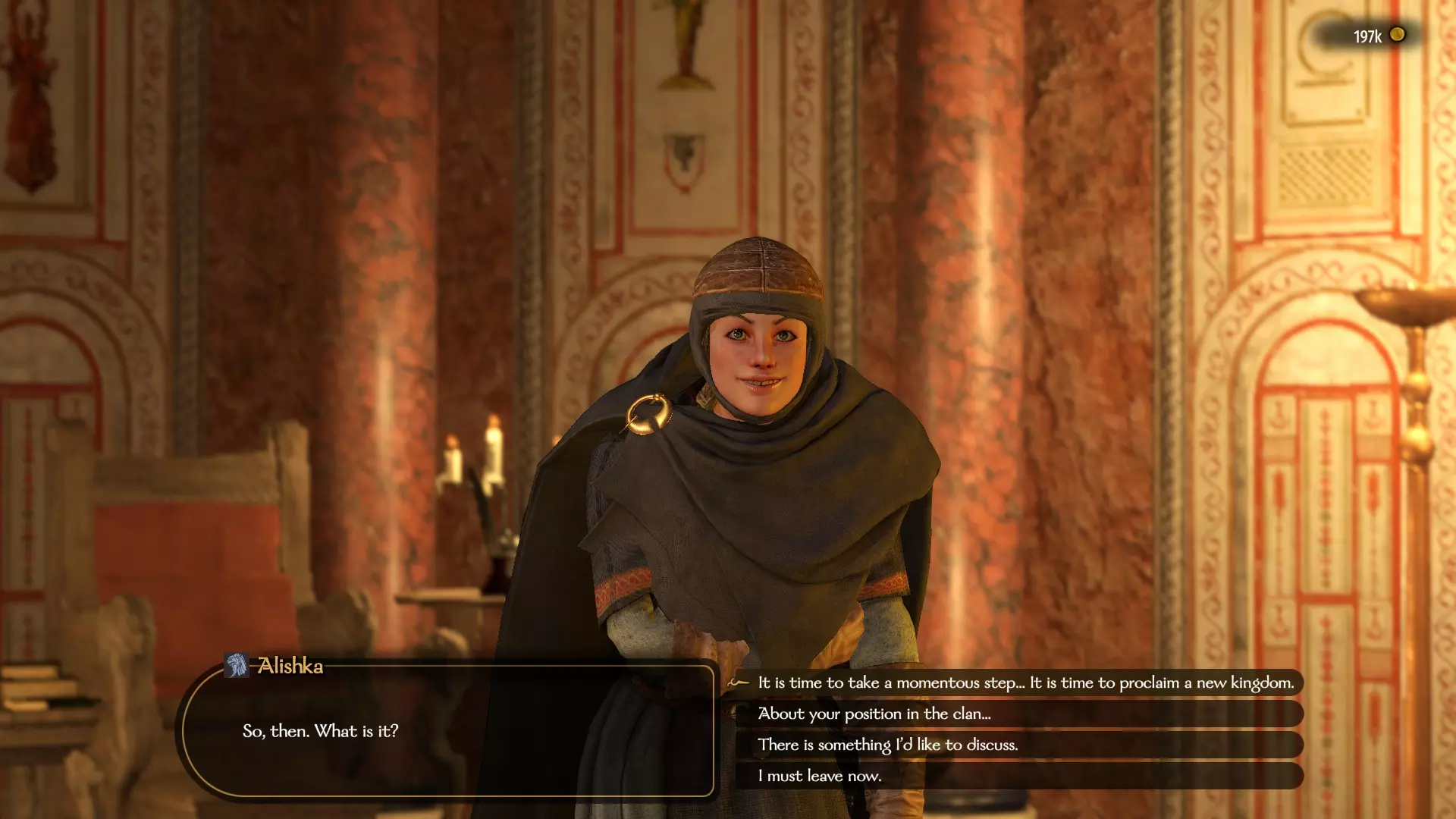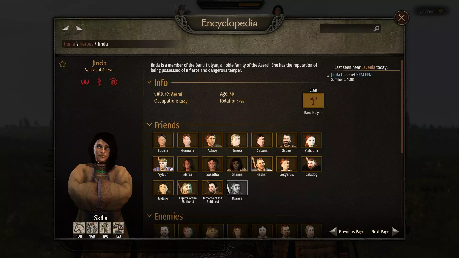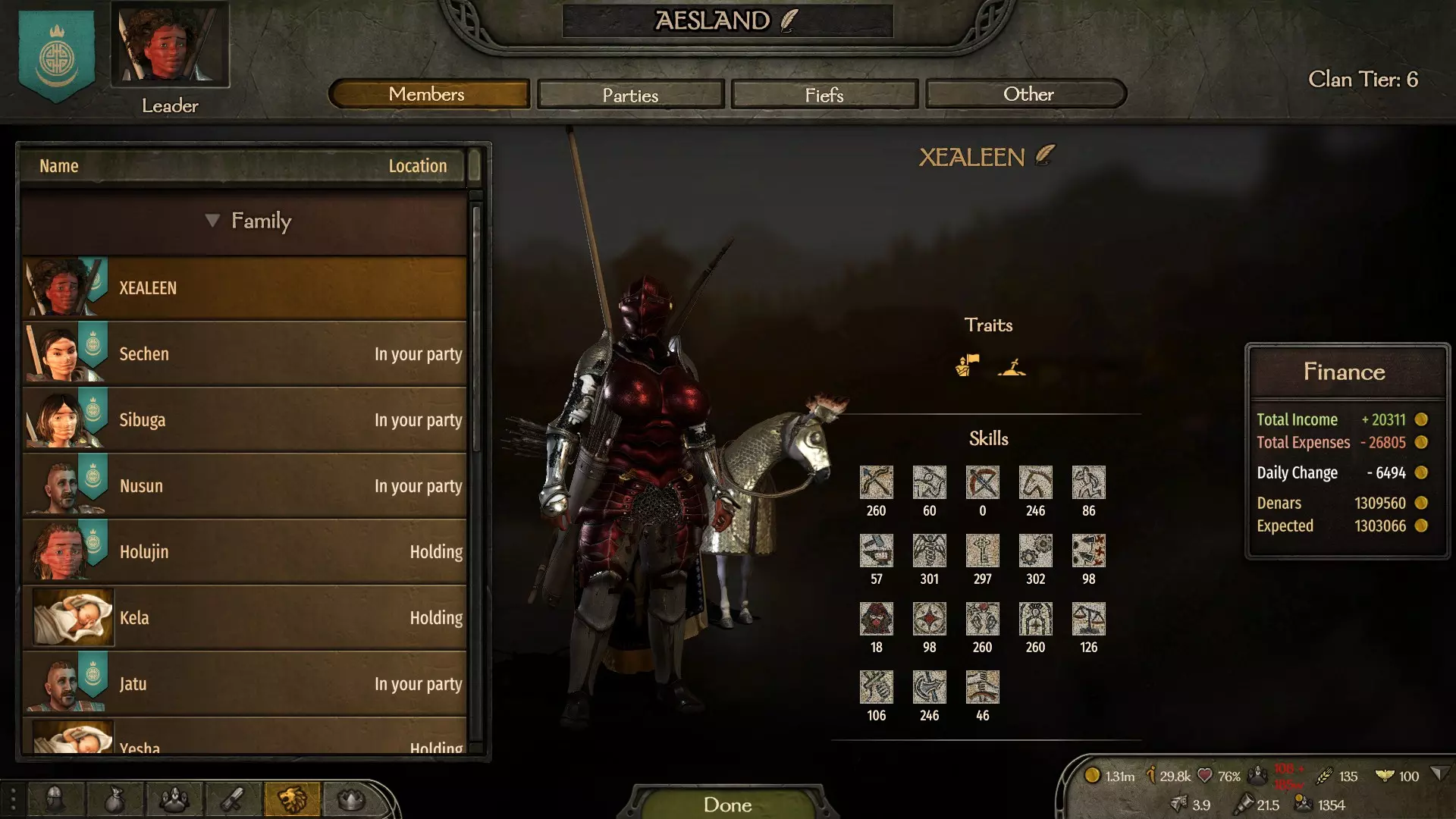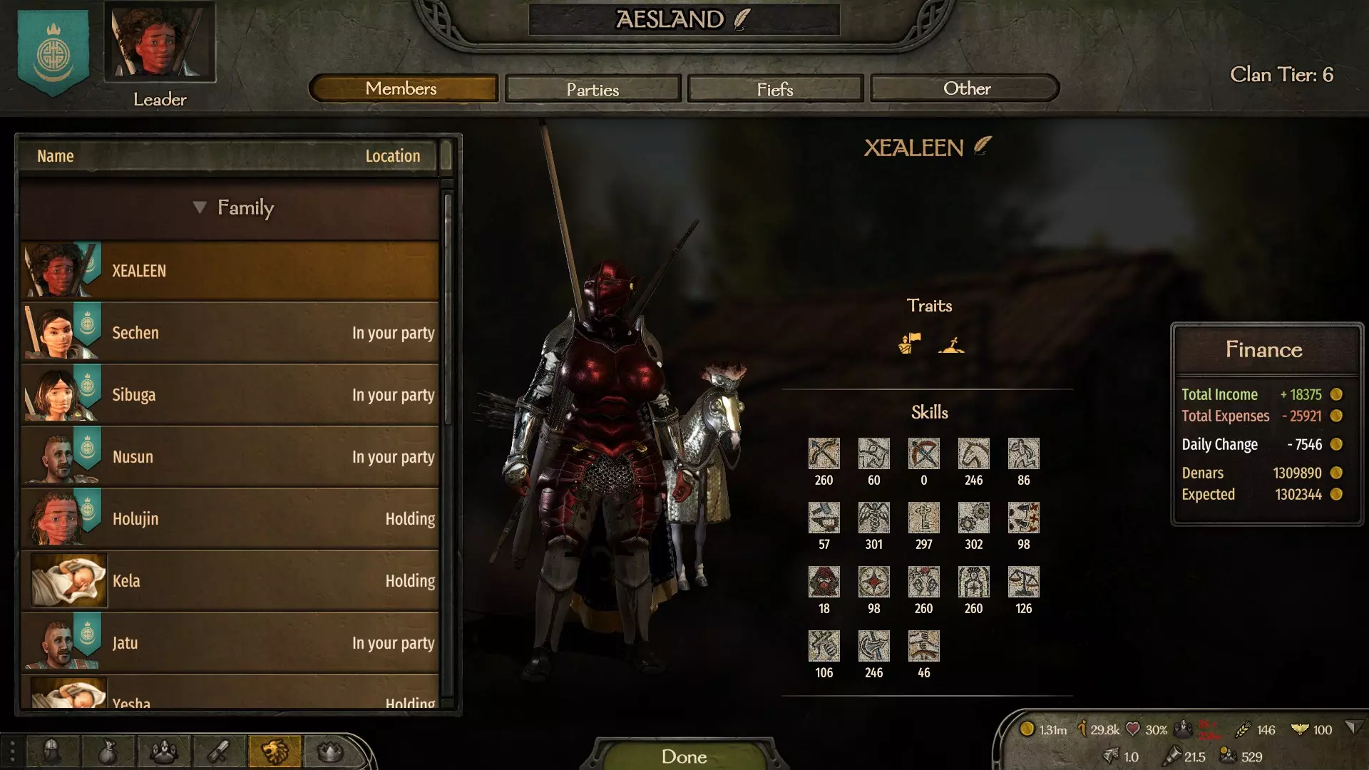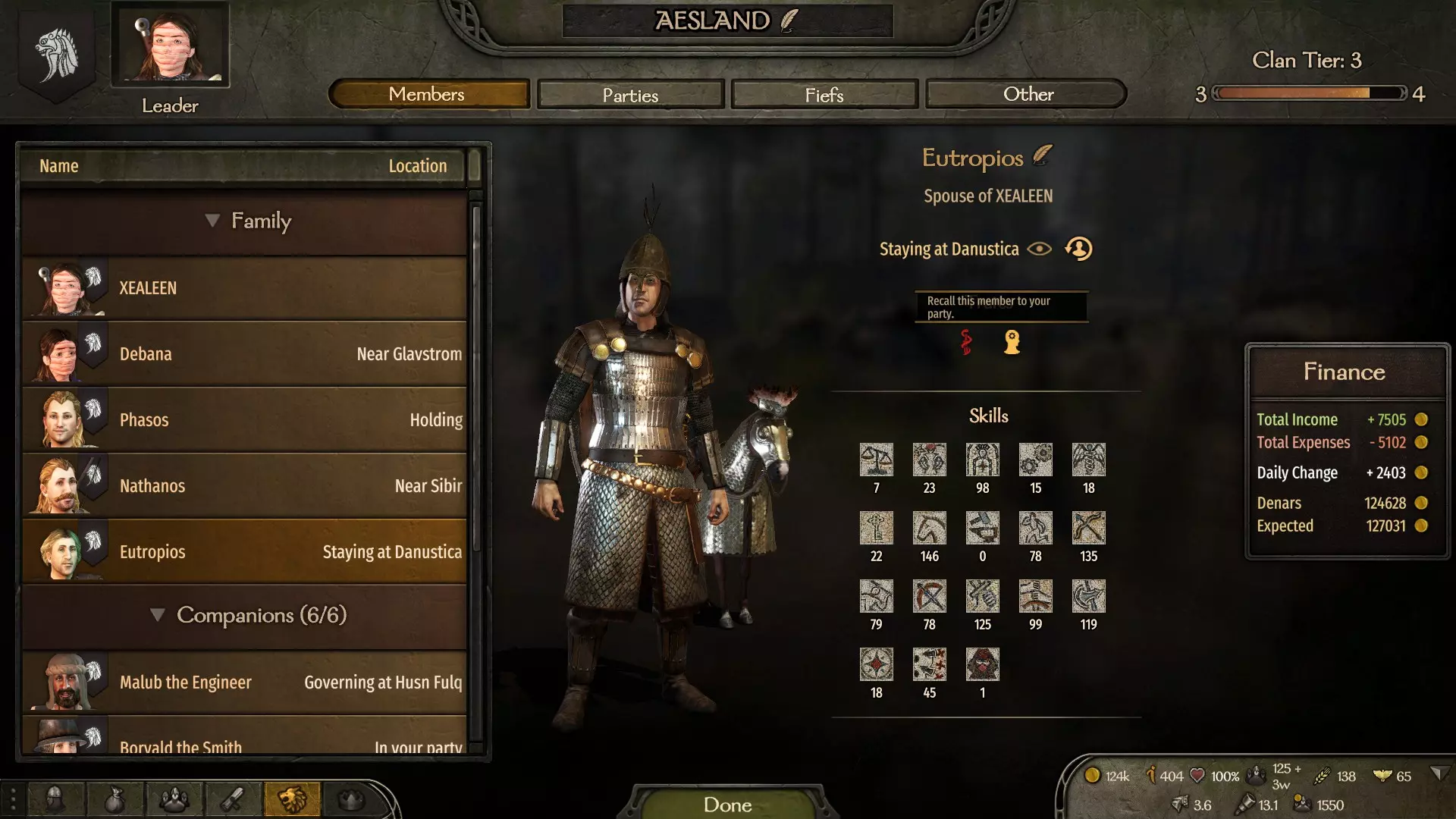 获得此成就有多种途径,区别仅在于你将统治哪个派系。 你既可以建立自己的国家,也可以加入一个现有的派系,然后成为其统治者。要做到这一点,你需要积累影响力,并与不同氏族的领主保持良好关系。在某些时候,派系的现任领袖可能会被杀或因年老去世,这时其他领主可能会推举你成为现任统治者。如果你建立了自己的国家,那么你将立即成为该国的统治者。 如果你创建了自己的国家,那么将不会有其他氏族受你控制;但如果你成为现有派系的领袖,所有氏族将立即归你管辖,这会简化获得该成就的过程。要有效扩大你麾下的家族数量,拥有较高的魅力和交易技能极为重要。这些技能树的专长能让你更容易说服敌方领主投靠你,并且能以更低的成本达成目标。 另外,不要忘记,如果你是个糟糕的统治者,那些已归顺你的家族也可能叛逃到其他势力,这会让你离预期目标越来越远。 那么,我们来依次了解如何吸引敌方家族投靠你。首先,你应该关注的是家族的领袖,而非普通成员。要了解你正在交谈的领主是谁,你需要点击他的名字,然后点击他的家族名称。如果是同一个人,那么你可以尝试在和平时期以及目标领主被你俘虏的情况下杀死他。