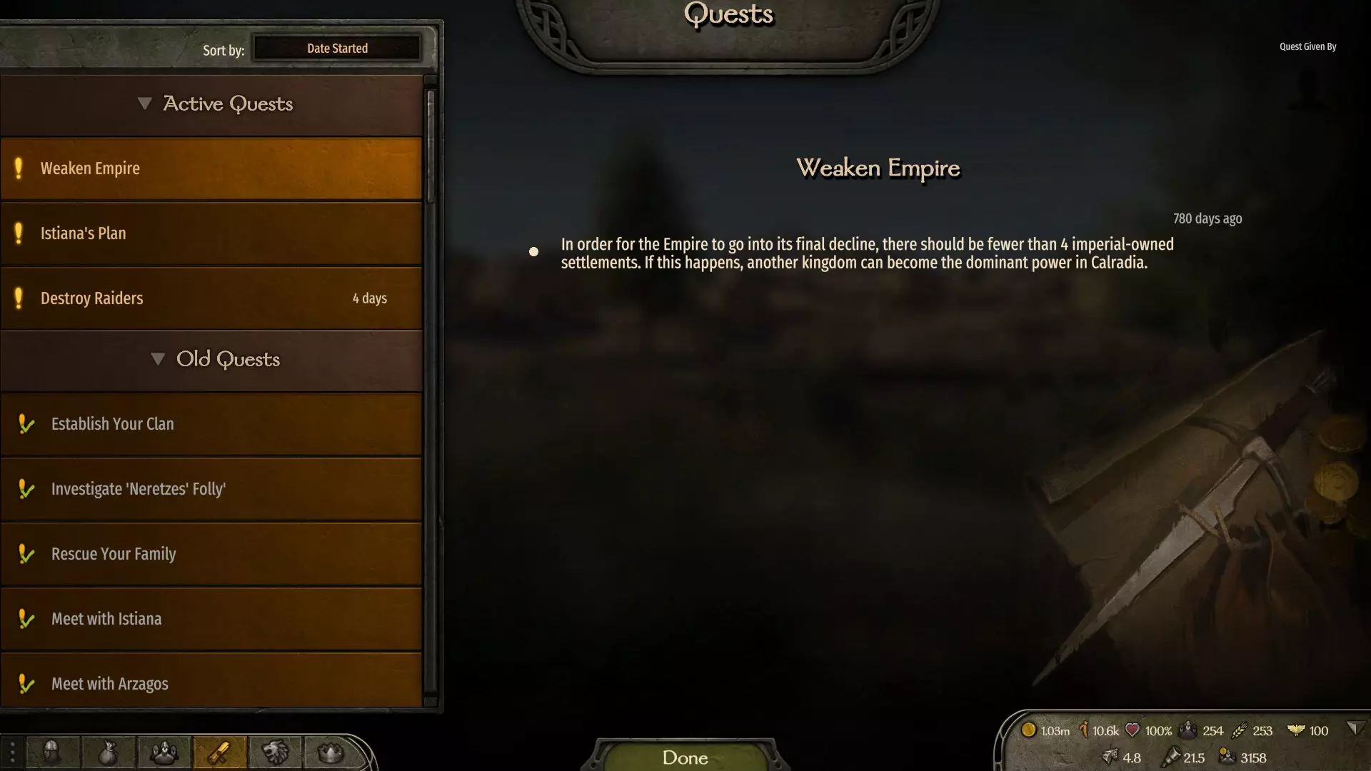 此成就要求你每日至少有10,000金币收入。无论你的支出有多高,最终是否盈利都无关紧要。重要的是你的收入达到成就描述中指定的数额。 前往家族菜单,查看屏幕右侧的财务信息。在这里你可以查看从城市税收、商队或工坊等获得的第纳尔收入。 你也可以在大地图上,将光标移至金钱信息处查看该数据,但在游戏后期,这个列表可能会过长,导致难以看清总收入信息。