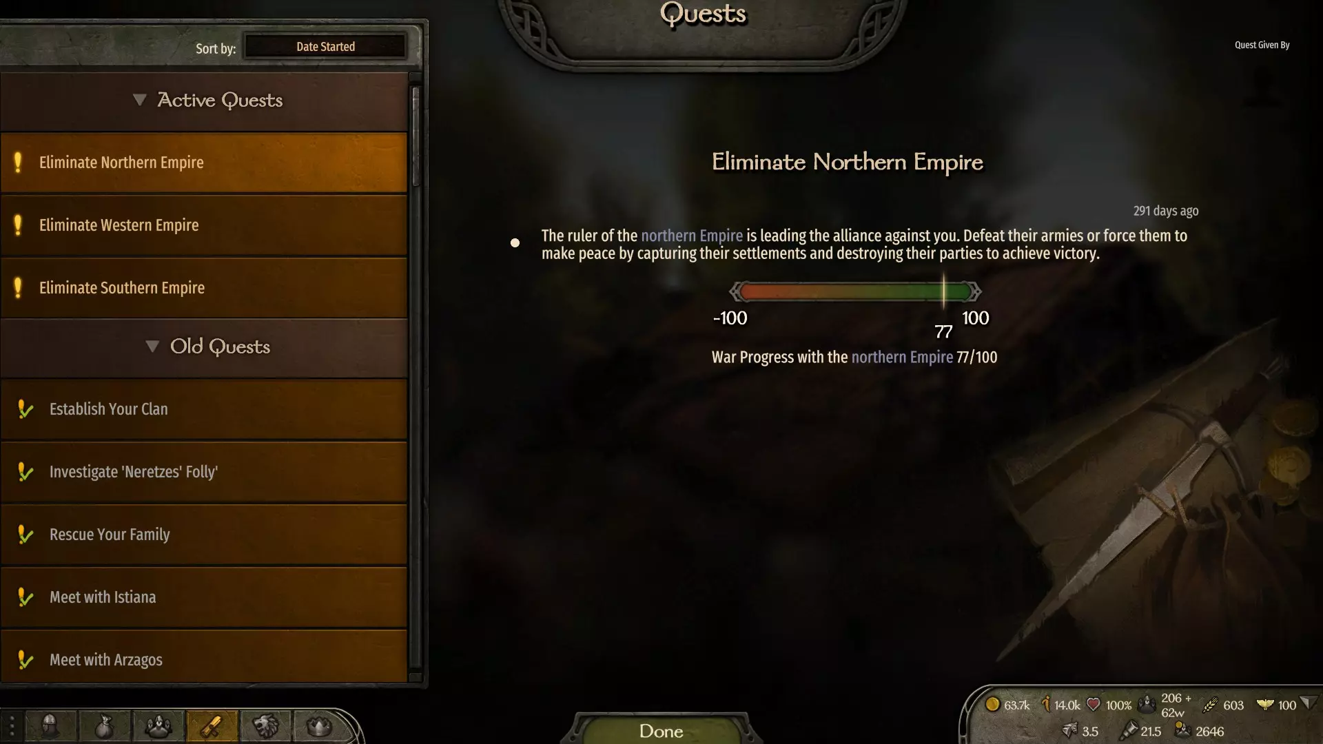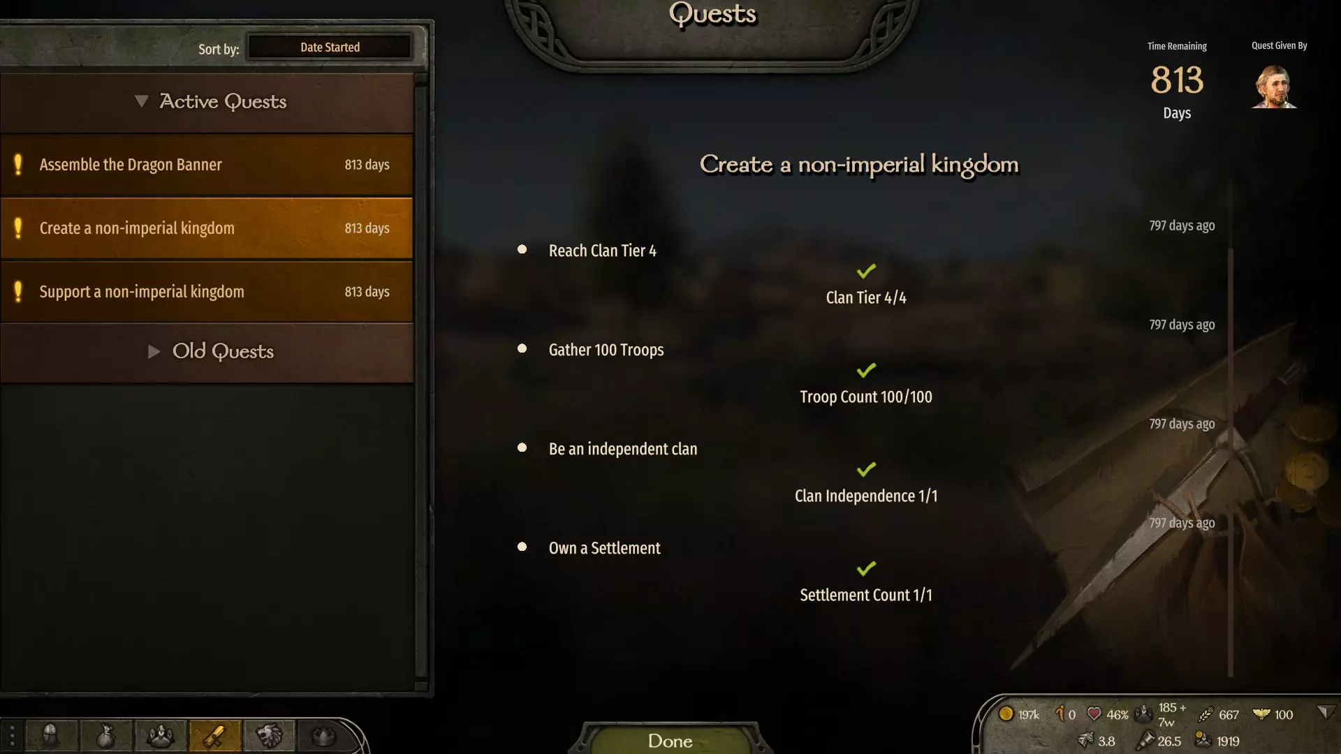 由于你的氏族与城市处于敌对状态,商人和工匠不会向你发布任务,若之前已有活跃任务,这些任务也会被取消并强制判定为失败。唯一会与你交谈并发布任务的角色是帮派首领,通常是右侧的两个角色。 要解锁此成就,我曾尝试寻找一个城市,其中有角色会发布可立即完成的任务,例如帮派首领需要武器或帮派正在招募成员。如果你的队伍中有合适的人员或 inventory 中有武器,那么接受任务后即可立即完成。
