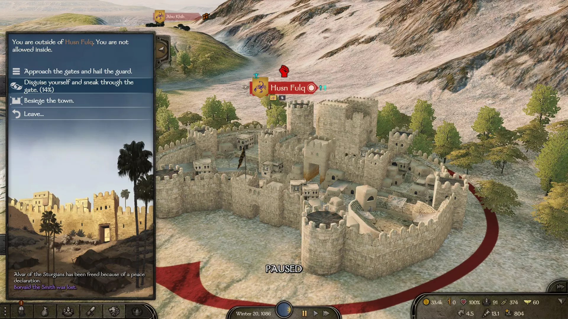 现在你必须进入城市并尝试潜行。你能否不被发现地进入城市取决于你的声望和【流氓】技能。