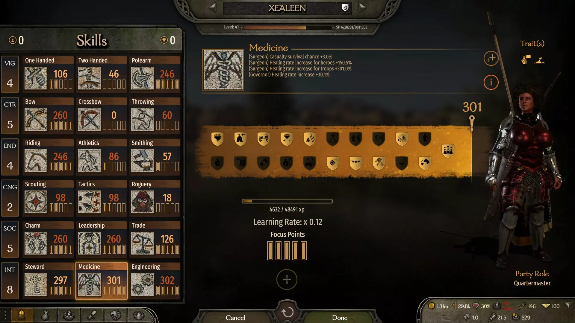 一个简单却需要长期努力的成就。从你的技能树中选择任意一项技能,将其提升至最高300点。每项技能的描述都会说明升级所需条件。 打造合适的角色build需要了解一些重要信息,因此从游戏一开始就要选择你需要的技能。你拥有的属性点决定了某一类别下的3个技能树。属性点数值越高,提升目标技能的速度就越快、越容易。角色每升4级会获得1点属性点,因此在角色等级较高时学习新技能可能会比较困难。 你还拥有专注点,每升1级会获得1点。每个技能最多可分配5个专注点,专注点将决定技能的等级上限以及所有技能经验值的获取倍率。倍率越高,技能等级提升速度越快。 因此,若技能树中拥有足够的属性点和所需的专注点,即可获得300点。当技能数值显示为红色时,说明已达到当前等级上限,若想继续提升等级,需添加属性点,添加专注点对此情况无影响。