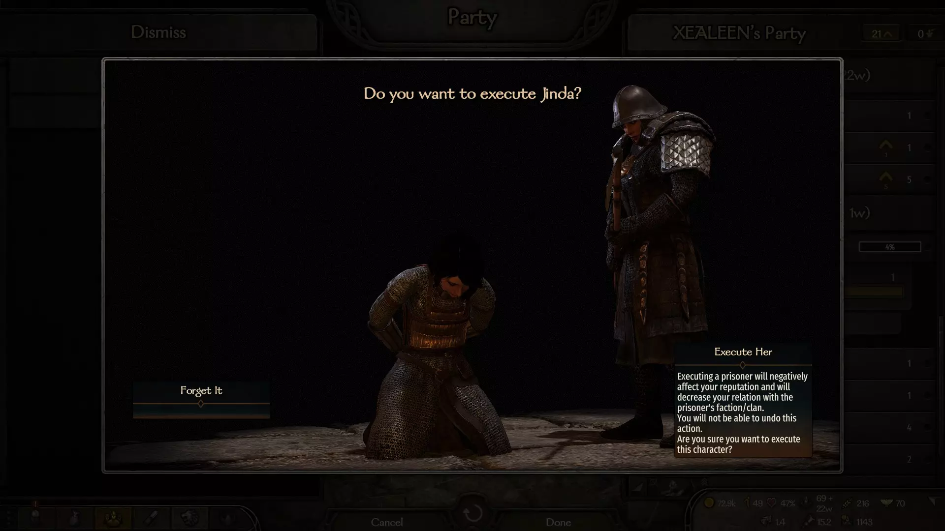 为达成此目的,你要尽可能地采取不诚实的手段。破坏关系最可靠且最快的方法之一就是直接采取军事行动——攻占城市、摧毁村庄以及处决被俘领主。处决被俘领主会使你与整个派系的关系降低25点。将任意一位领主的好感度降至-100点(或接近这个数值,我当时是-97点就解锁了成就),然后俘虏他们。