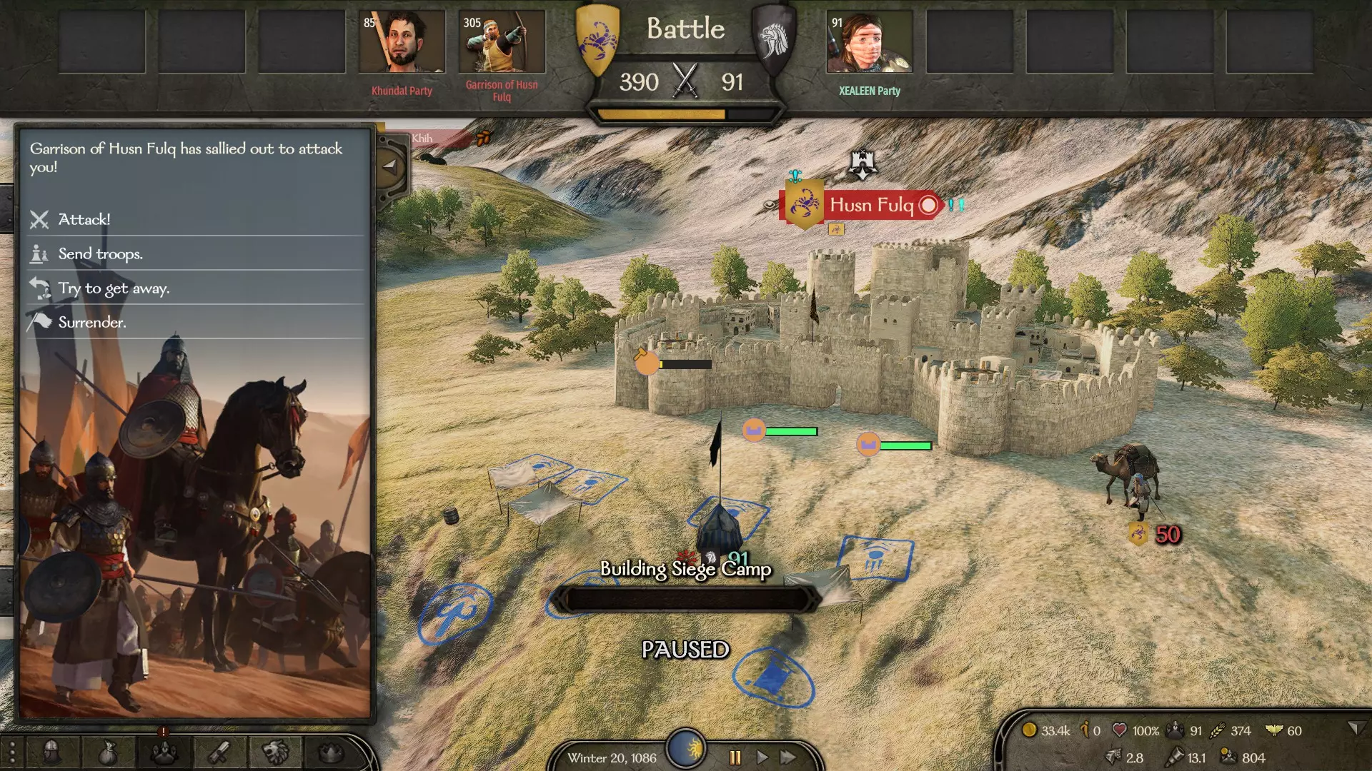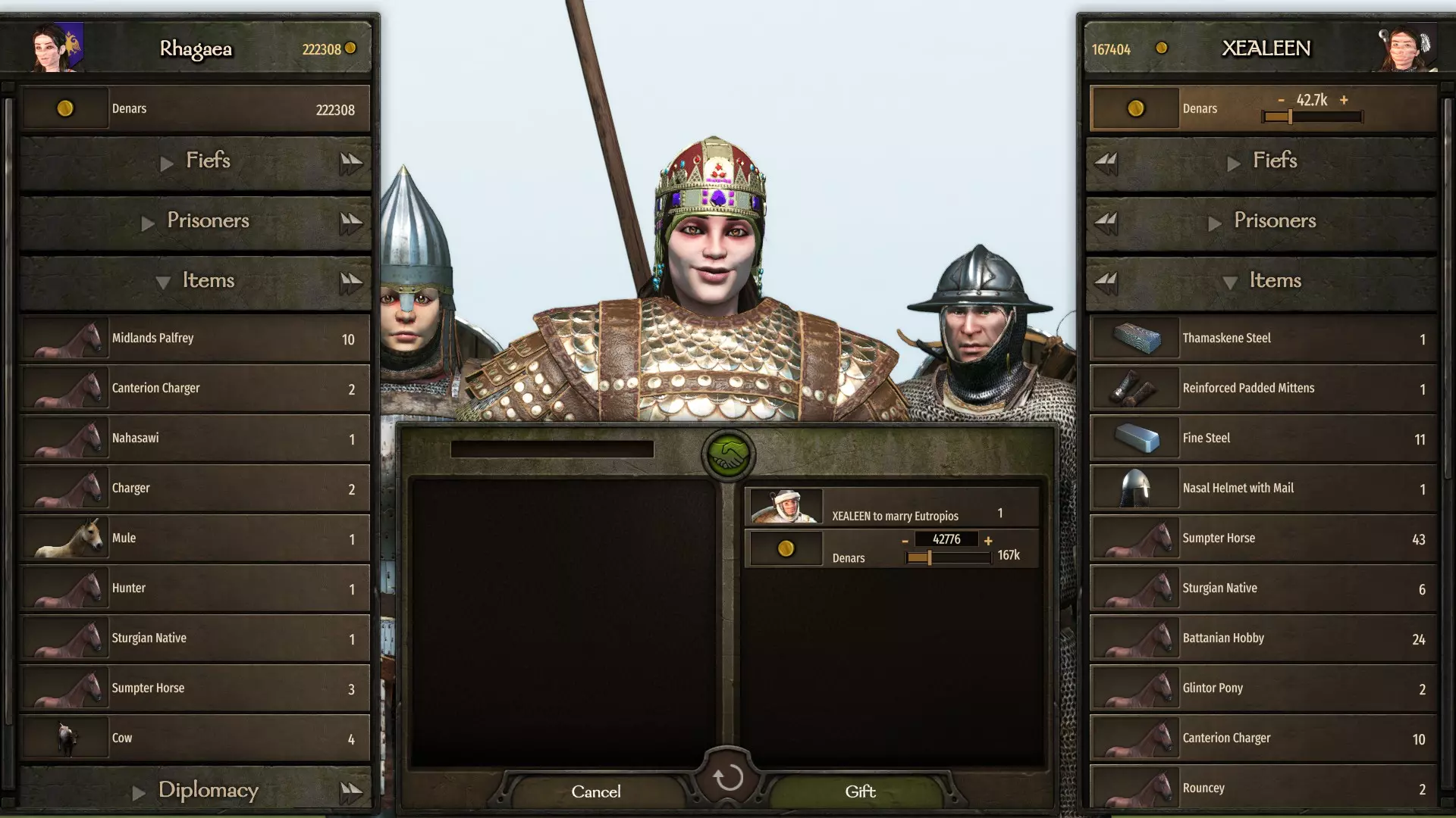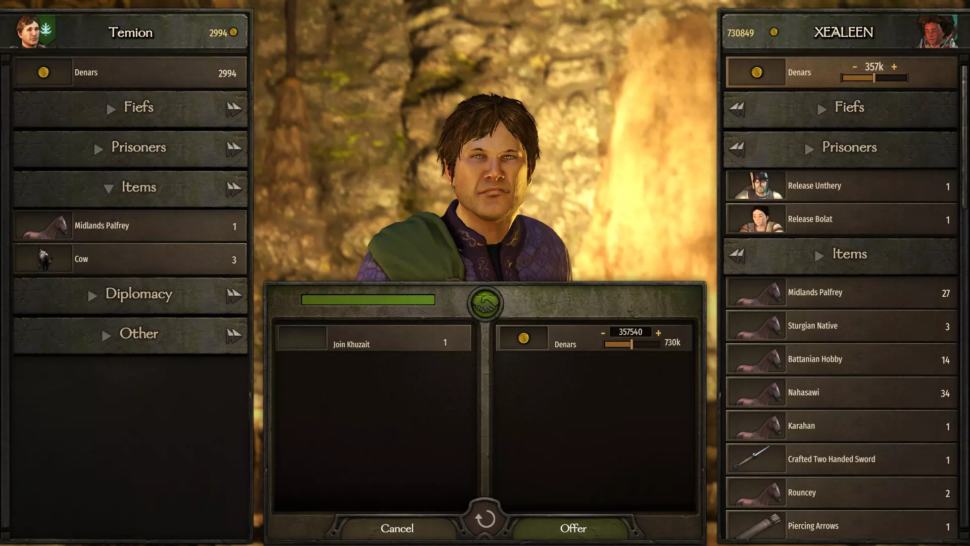 之后,交易窗口会打开,领主会告知你投靠你这边是极其危险的,需要你在经济上支持他。在这里,你可以向领主提出各种条件,让他加入你。这些条件可以是金钱、将一座城市或城堡交给他、要求释放他被囚禁的亲属,或者从你的库存中转移物品。点击屏幕中央的握手图标,领主会表明他同意的提议。要记住,有时候领主需要极其庞大的金额,最高可达100万第纳尔,尤其是当你面对的是一个富裕且强大氏族的首领时。