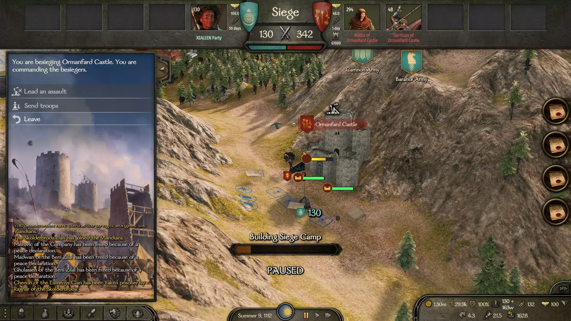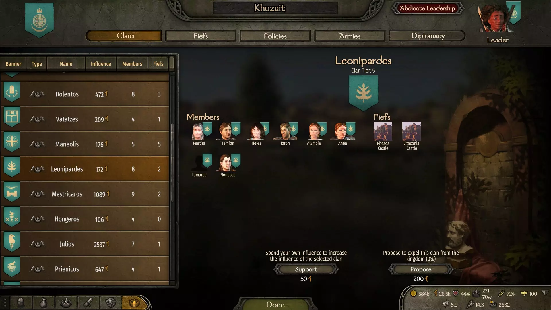 如果你同意领主的条件,那么他的氏族将成为你国家的一部分,他的所有下属都将成为你的盟友,即使你刚刚与他们战斗过。你可以前往王国菜单,在氏族部分查看你的新封臣。在这里你还可以了解到目前有多少氏族在你的控制之下,当达到21个(包括你自己的氏族)时,你将获得成就。