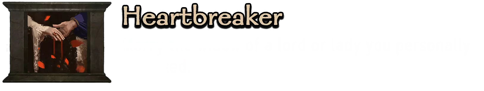 这个成就的达成与否取决于你角色的性别。由于我玩的是女性角色,我对找到并处决某个男性角色的配偶后与他结婚的可能性很感兴趣。 我们要找到一个合适的角色,重要的是他和你的关系要好。当你处决他的妻子后,你们的关系会恶化,但必须仍然保持在足够高的水平,他才会同意和你结婚。 掌握 ✔