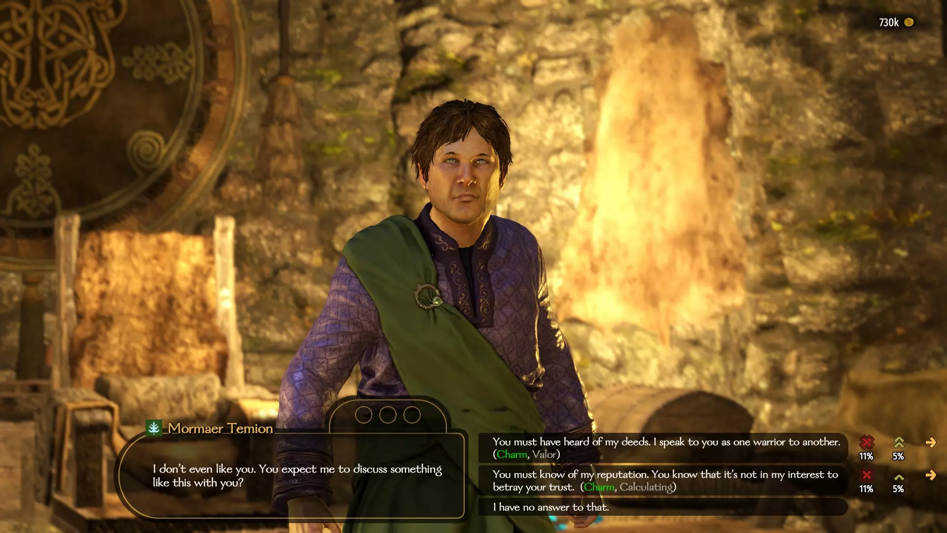 当领主同意听取你的提议后,你需要进行一个包含选项的小型迷你游戏。每条对话选项的成功与否取决于你的魅力技能。初始状态下,你需要用4个论点说服领主,而当魅力等级较高时,所需论点数量可减少至3个。 不过,每个对话选项都有成功和失败的可能。如果在对话结束时未能说服领主投靠你,他将不再讨论此事,因此尝试说服前建议存档。若对话结束时未能填满至少一个说服进度条,领主会拒绝归顺并继续效忠于其原主人。只有在一次对话中填满所有单元格,他才会同意你的论点。