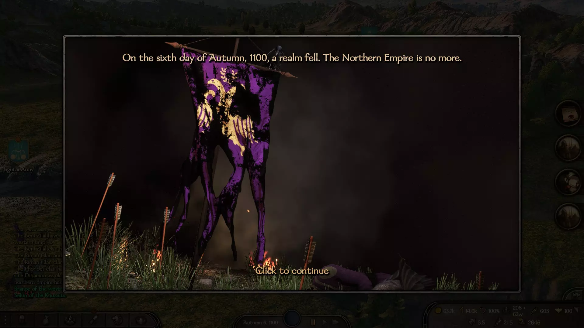 之后,所有帝国派系都会向你宣战,且无法通过谈判结束战争。你必须攻占城市、掠夺村庄、击败军队并俘虏领主,以彻底摧毁该派系。一旦任何一个帝国派系被如此消灭,你就能获得相应成就。