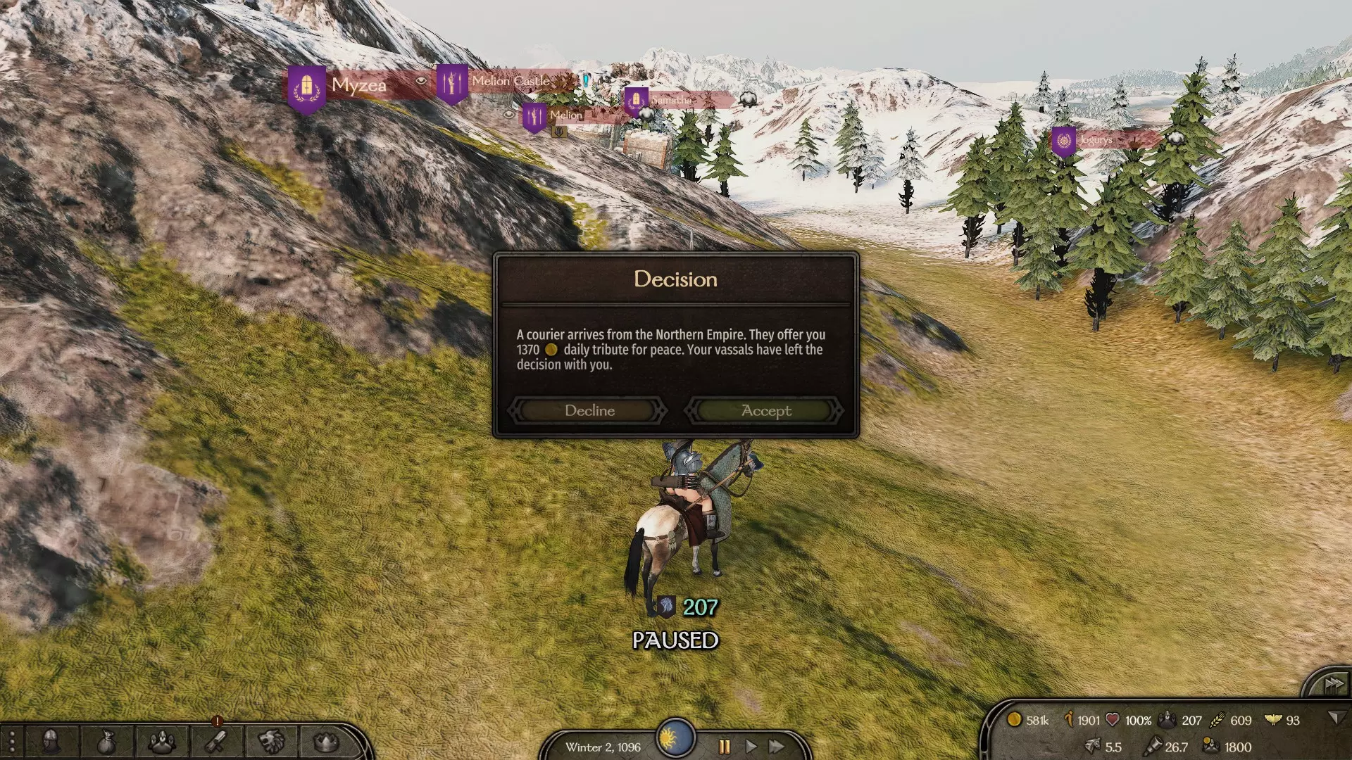 请注意:如果领主的要求过高,你不得不拒绝领主的提议,那么在未来,即使你积累了所需的资金,他也可能会以你们之前已经讨论过这个问题但未能达成协议为由拒绝加入你。