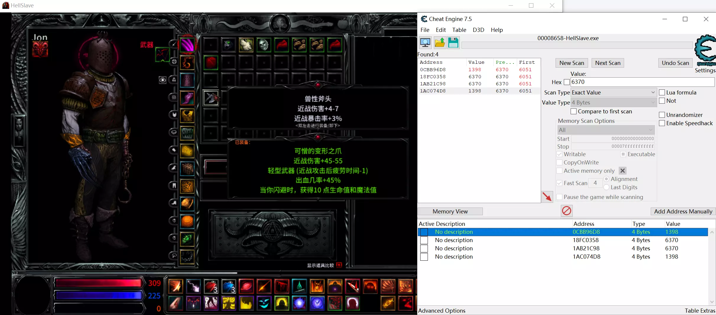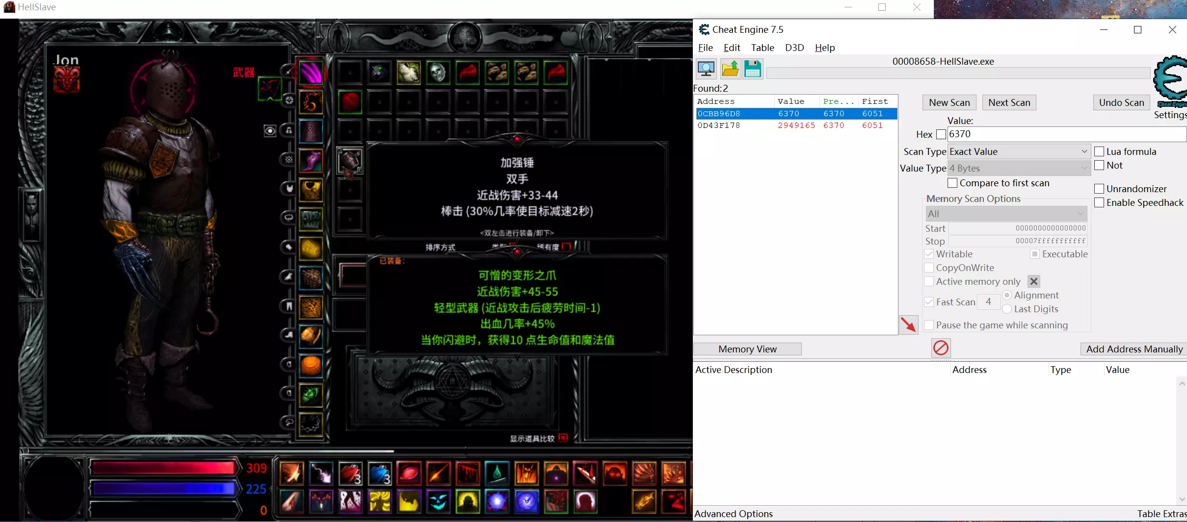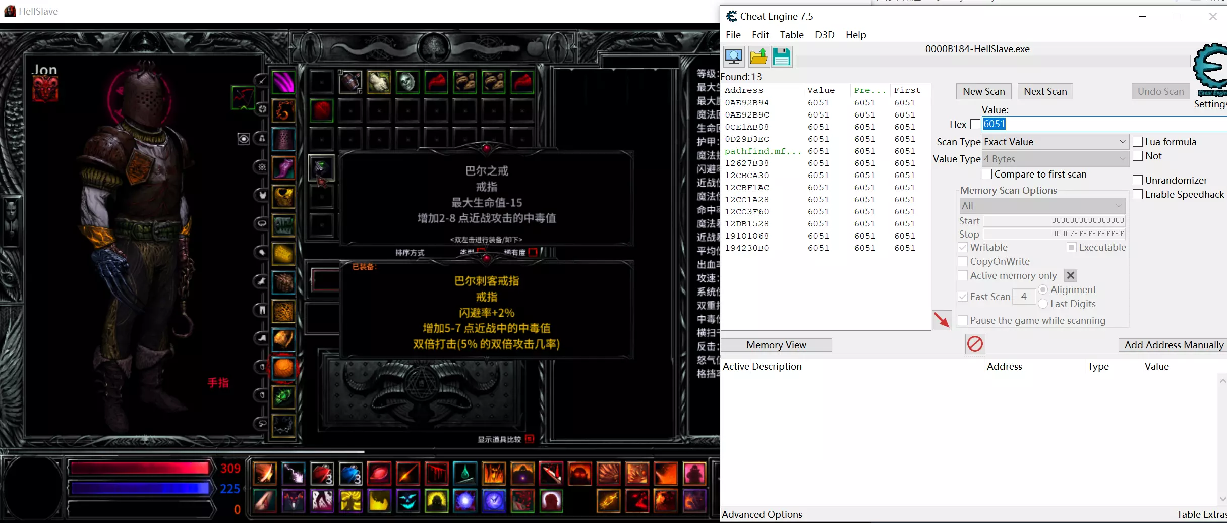 刷锻造配方武器刷得让人恶心,研究了一下CE修改,严重破坏游戏乐趣,慎用!!! 准备 1.下载安装CE; 2.游戏中已解锁对应的锻造配方; 3.打开游戏安装目录下的“Hellslave Data”文件夹中的PowersObjectsCN.ini; 4.预留几件没用的装备。 过程 1.将预留的装备随意换到一个格子上,记住它的名字,去PowersObjectsCN.ini找它的ID号,然后用CE搜索;(例如巴尔之戒,ID6051)