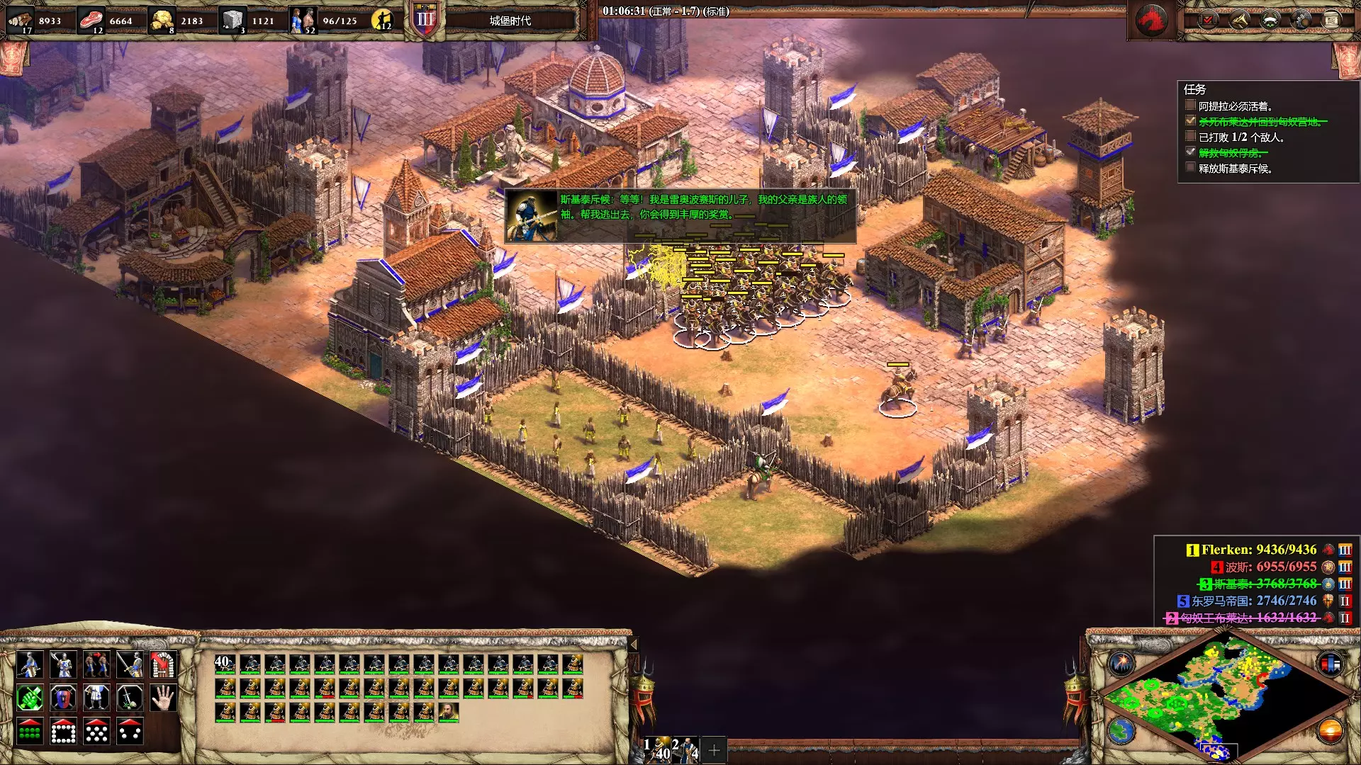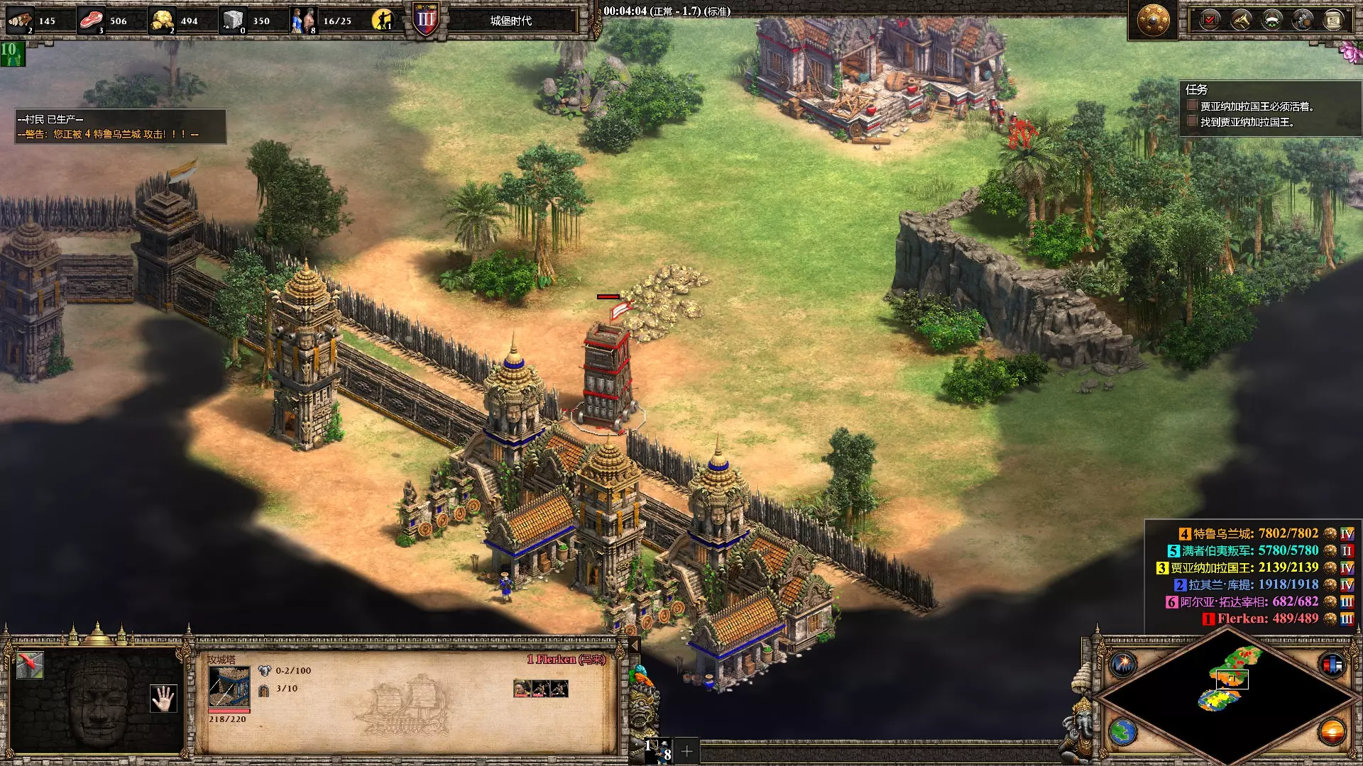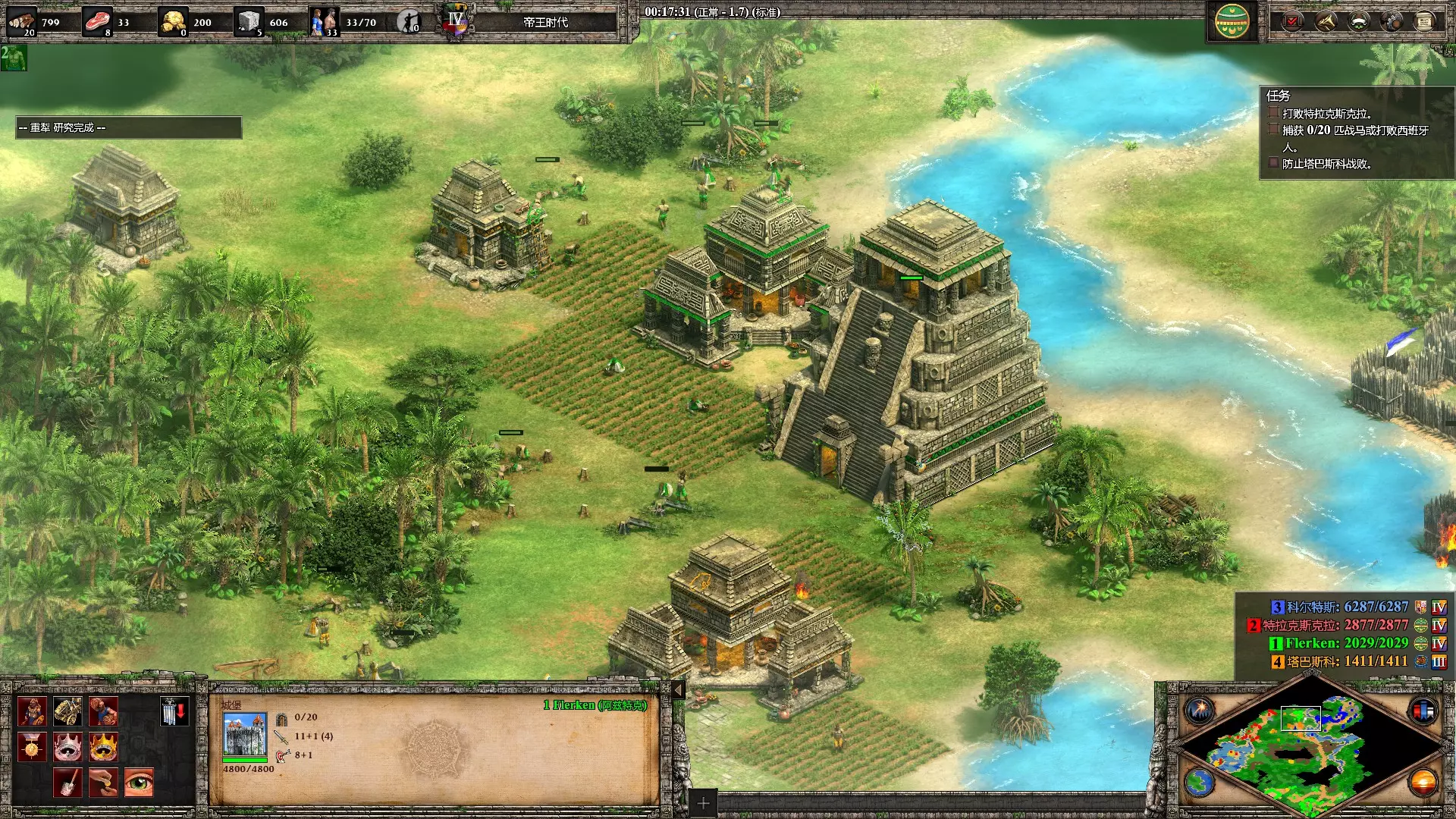 热辣十足 在第三个蒙提祖马任务【羽蛇神】中防止塔巴斯科战败 初期攒够木头后,直接派遣一群农民到盟友基地建造城镇中心协助防守,有石头后再建造一座城堡即可确保安全。