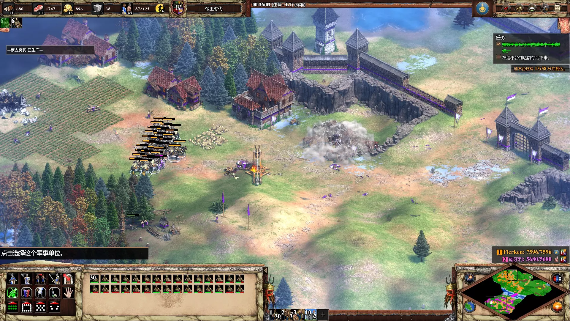 进取之心 在第六个成吉思汗任务【蒙古太平】中,在速不台到达前打败匈牙利人 时限为40分钟(游戏时间),开局可以多花点时间发展经济组建部队,在桥头造城堡防守,总攻之前攻击一下对面箭塔引诱敌方大部队到城堡附近全歼之,用初始的炸弹人清掉箭塔,只要用巨型投石机敲掉敌方的两座城堡和两个城镇中心就可以获胜