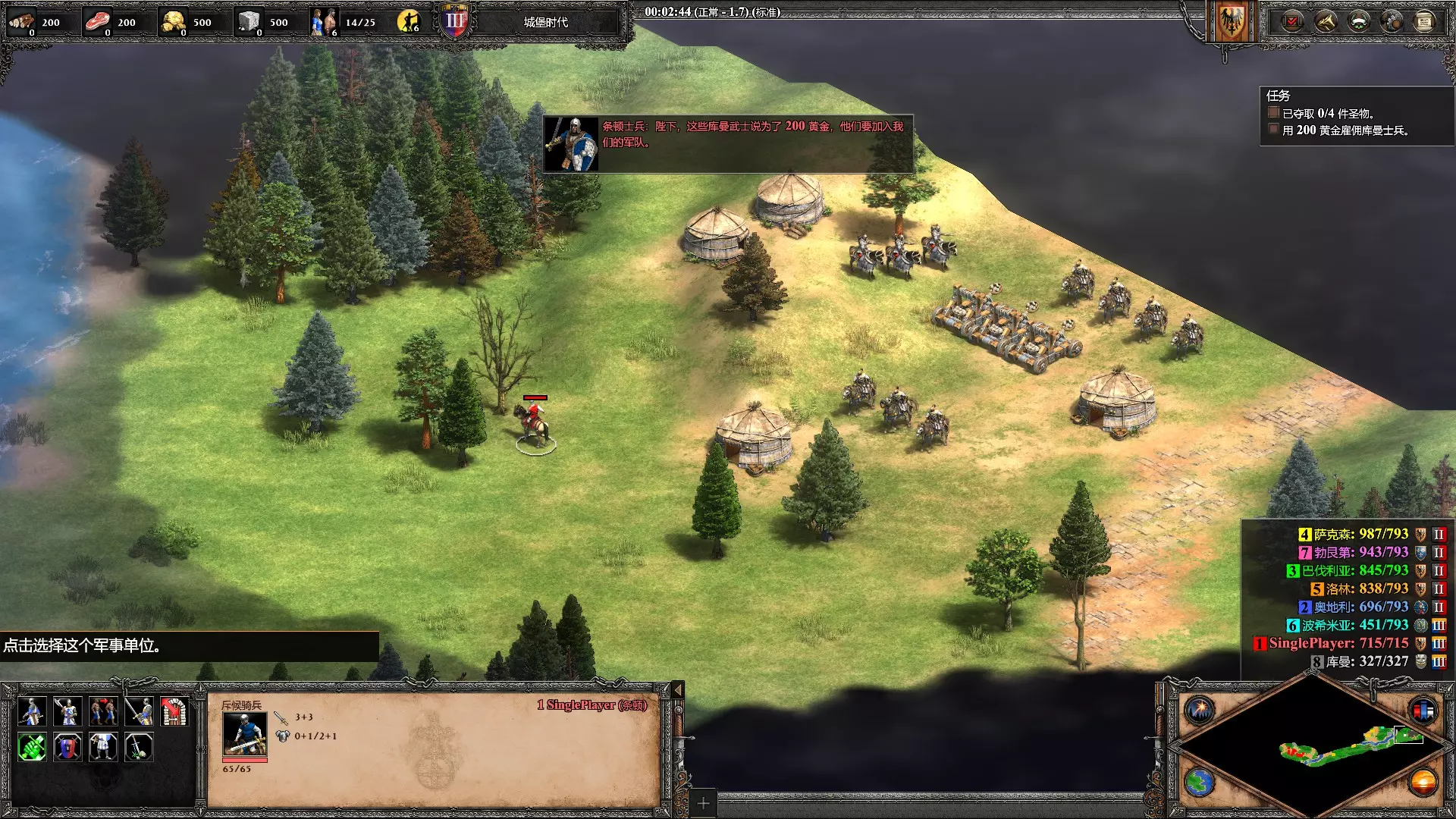 无用之人难以驯服 用蒙古骑射手抢掠500黄金 需要用到怯薛,新增文明鞑靼的城堡特殊兵种,攻击敌方单位时每秒可以产生0.37黄金。帖木儿战役过程中应该可以自然解锁