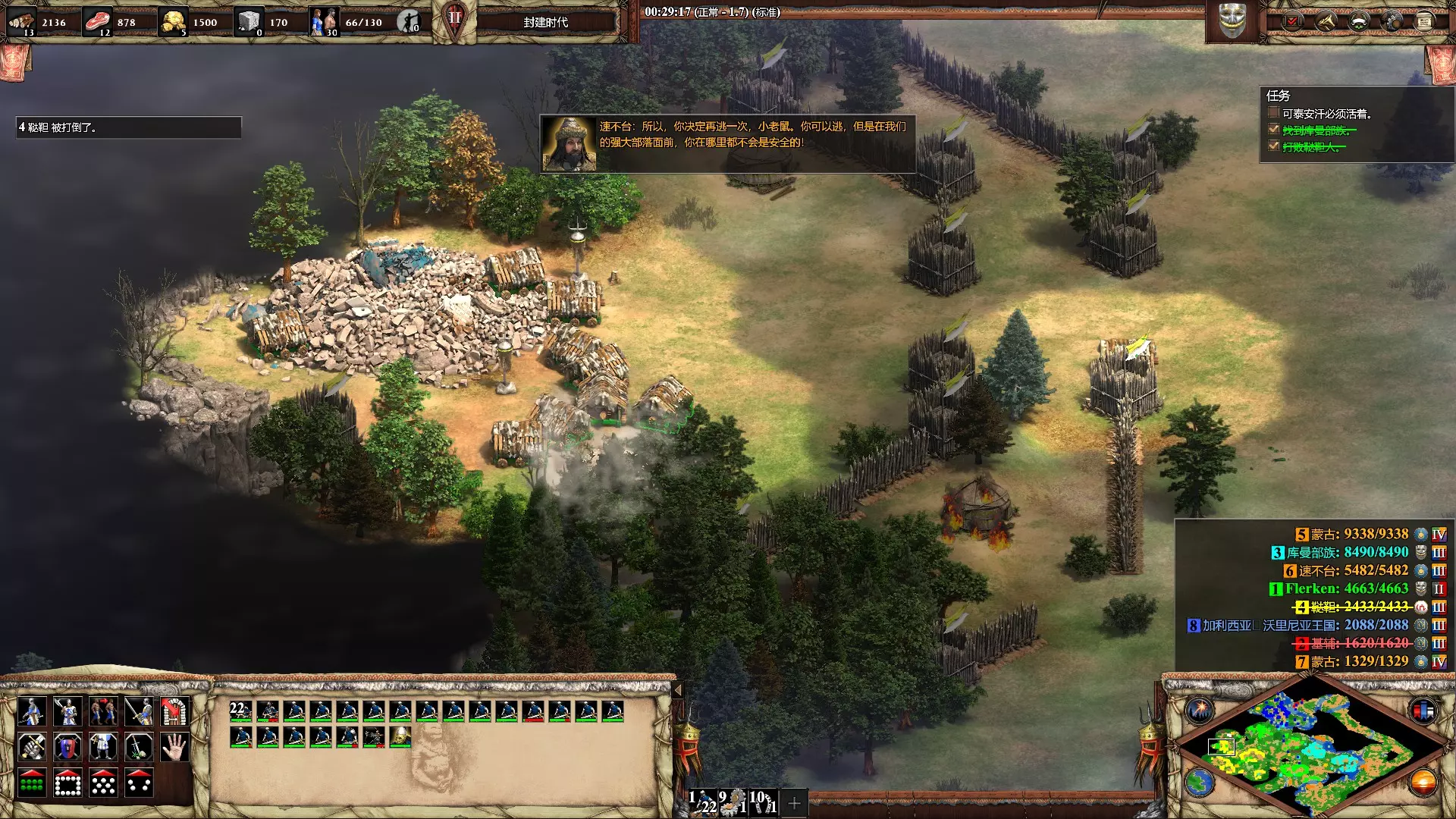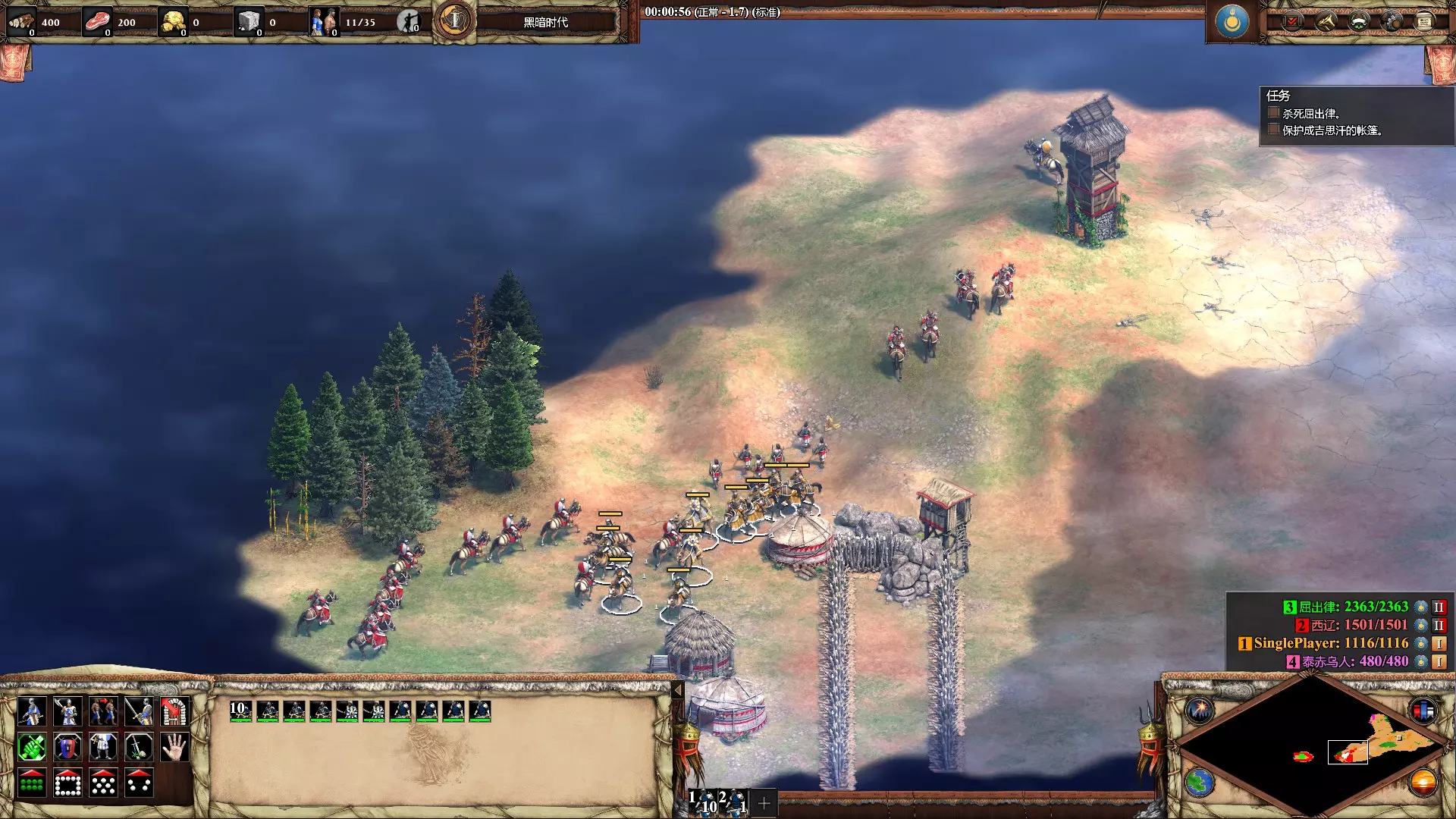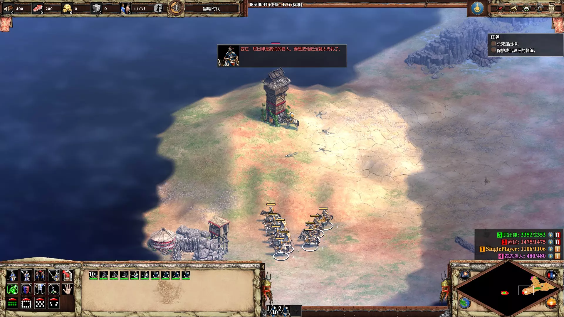 暗杀屈出律 在第二个成吉思汗任务【复仇人生】中,在前20分钟内杀死屈出律 开局分出一个轻骑攻击西辽(红色)的箭塔,然后带着整个西辽大军出去兜风